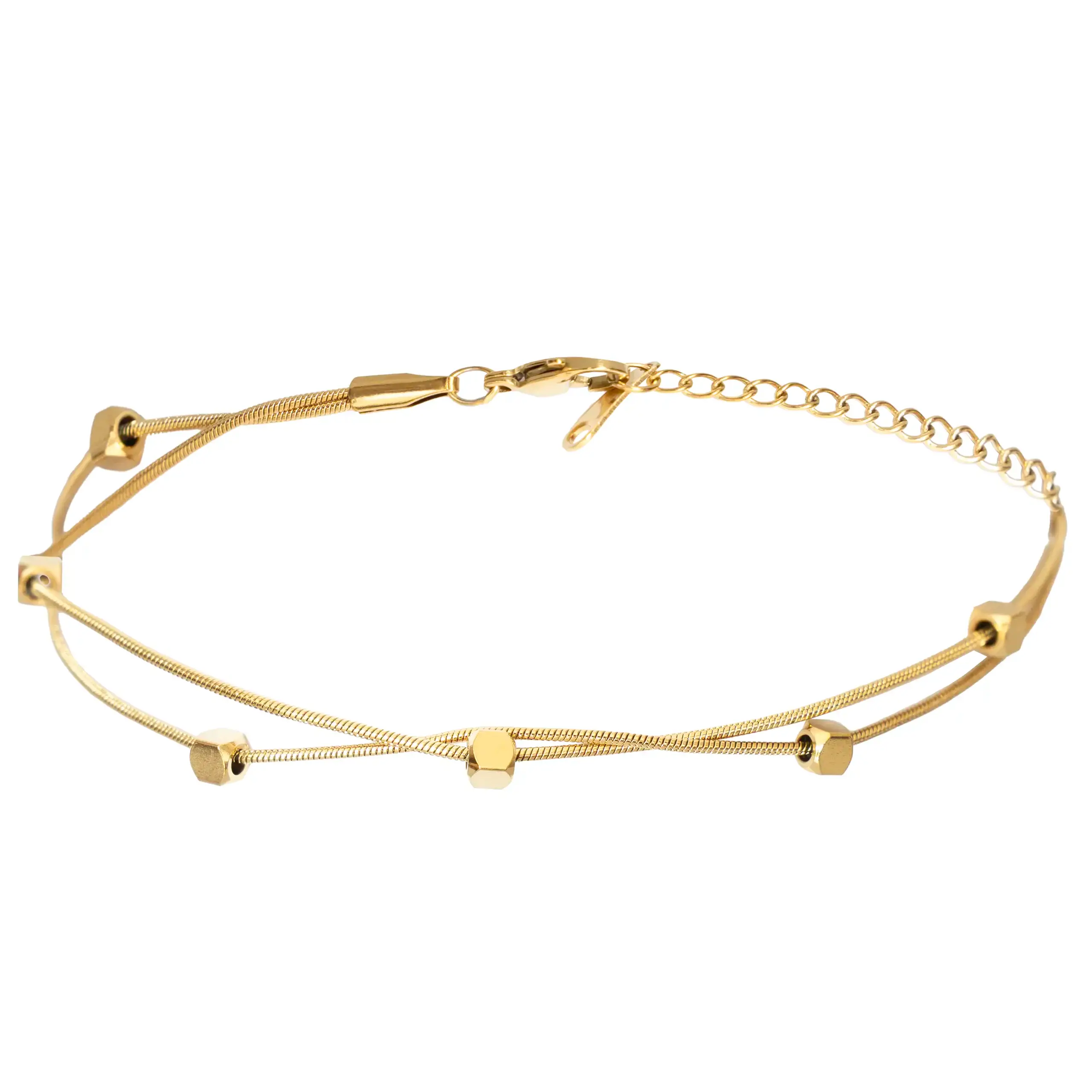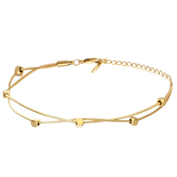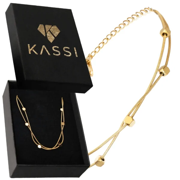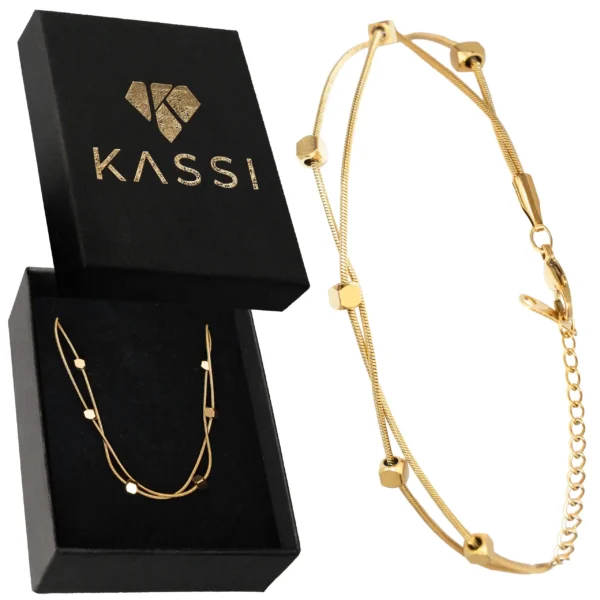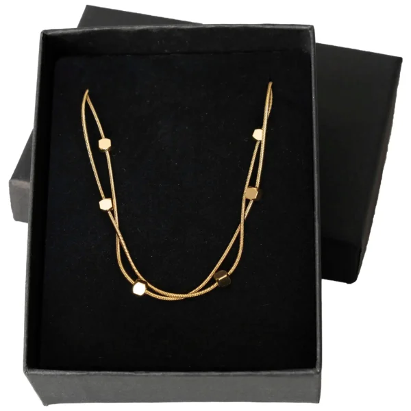 Wykonana z pozłacanej stali szlachetnej, zachwyca podwójnym łańcuszkiem w wężowym splocie, ozdobionym geometrycznymi kostkami, które nadają jej współczesnego charakteru.