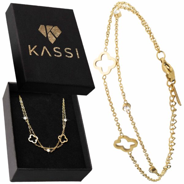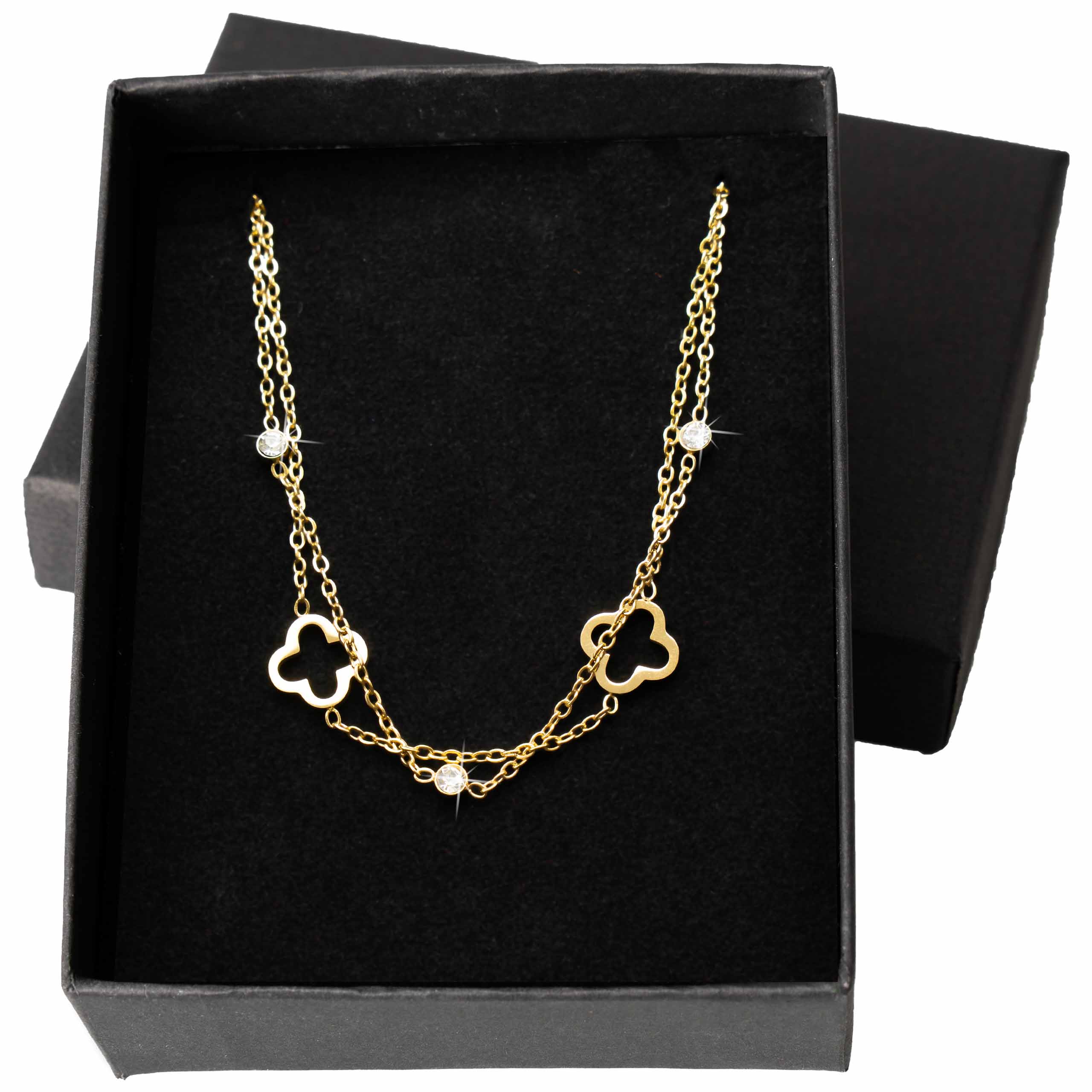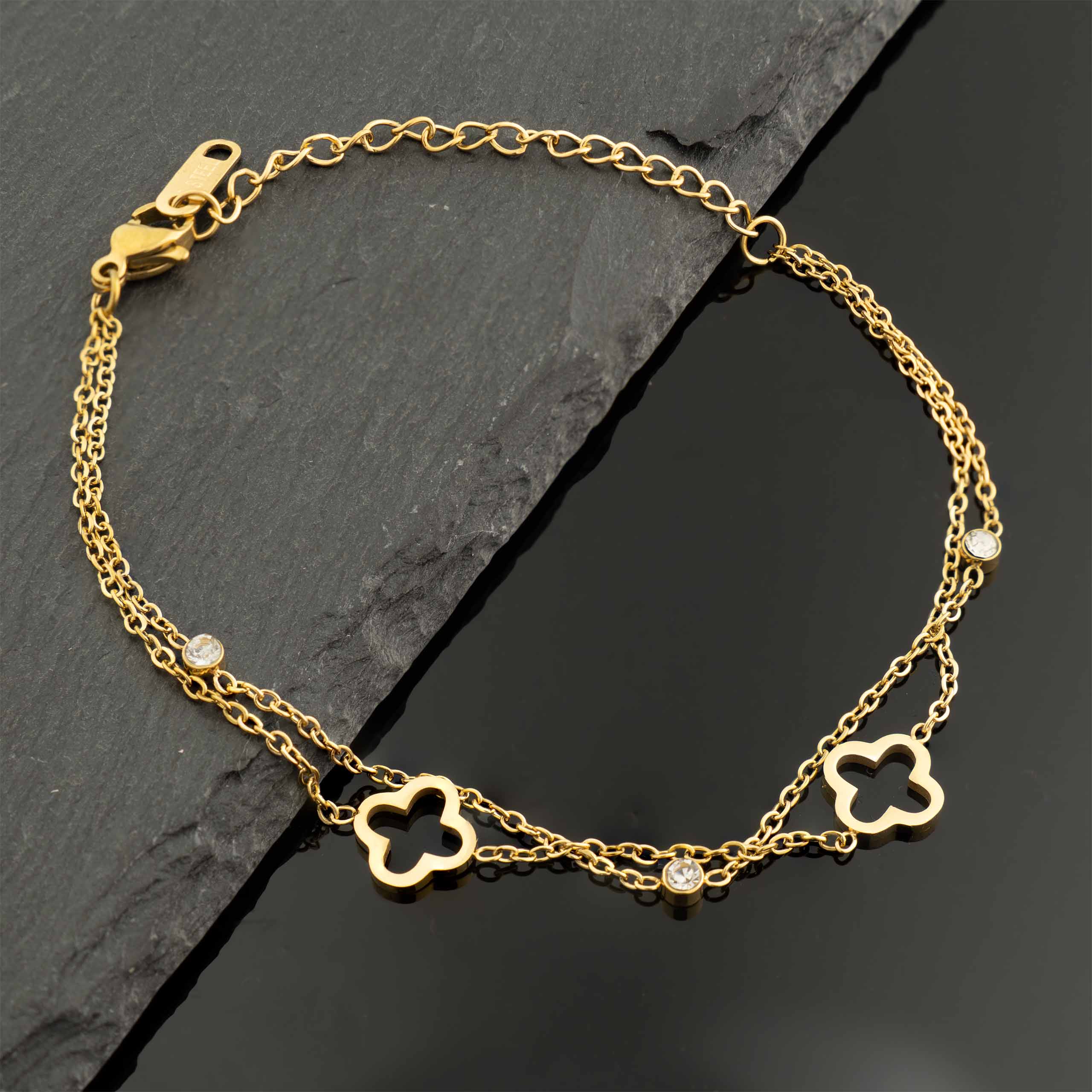 Najgorętszy trend 2025 – podwójna bransoletka z trzema marokańskimi koniczynkami (koniczynkami w stylu Van Cleef) i błyszczącymi cyrkoniami osadzonymi w łańcuszku. Symbol szczęścia, dostatku i luksusu w wersji, którą możesz nosić codziennie.