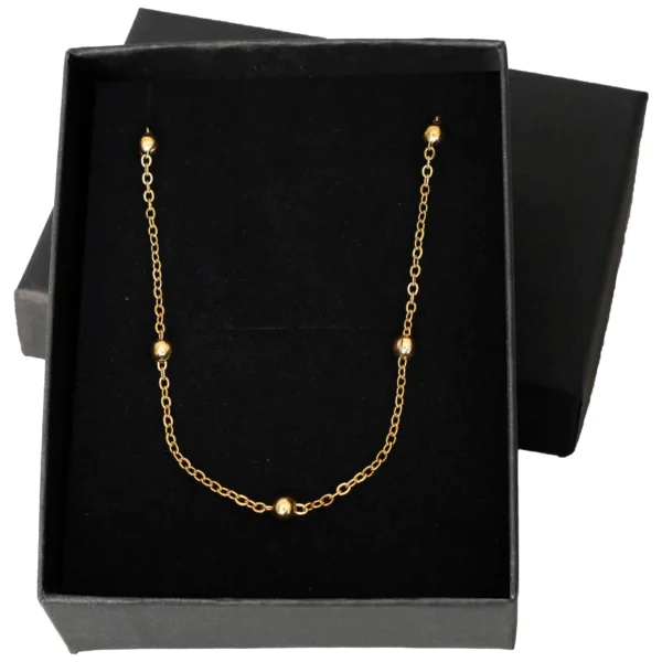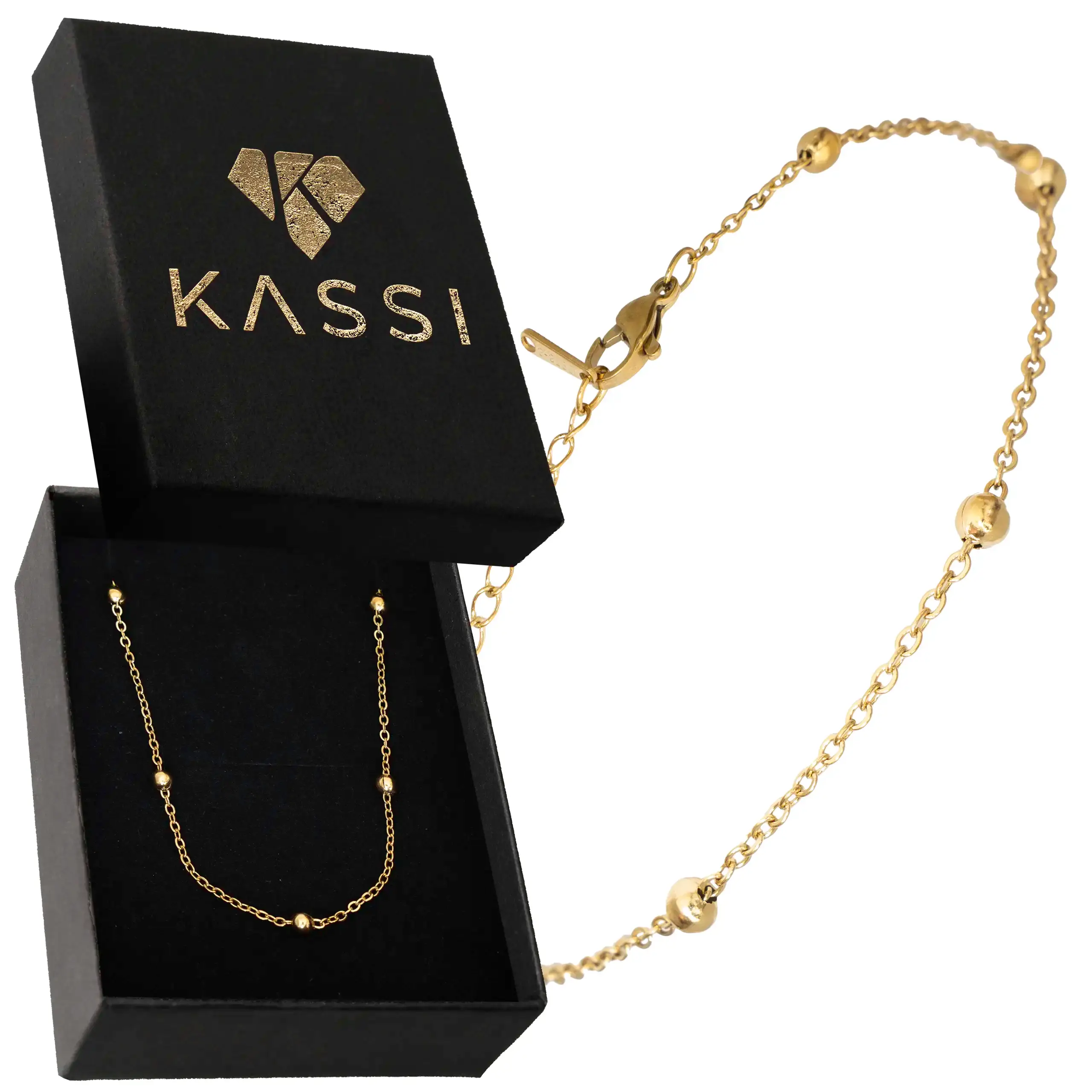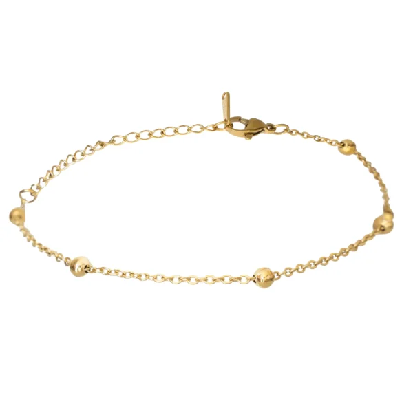 Wykonana ze stali szlachetnej i pozłacana, zachwyca minimalistycznym designem z delikatnym łańcuszkiem, ozdobionym drobnymi kuleczkami, które dodają jej wyrafinowanego uroku. Jej złoty blask pięknie komponuje się z każdą stylizacją – od codziennych po eleganckie wieczorowe looki. Bransoletka jest nowa, nie zawiera niklu, więc jest idealna dla alergików, a jej lekkość zapewnia komfort noszenia przez cały dzień. To doskonały wybór na prezent lub mały luksus dla Ciebie – dodaj odrobinę klasy do swojej kolekcji biżuterii już teraz!