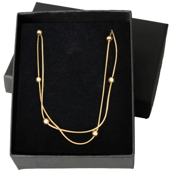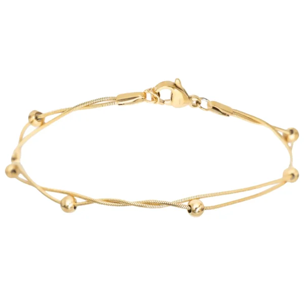 Składa się z dwóch delikatnych łańcuszków o splocie wężowym, splecionych w subtelny wzór, ozdobionych małymi, kulistymi koralikami dla dodania uroku.