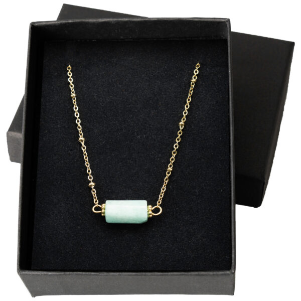Ta urokliwa bransoletka łączy w sobie delikatność i naturalne piękno, tworząc wyjątkowy dodatek do każdej stylizacji. Wykonana z pozłacanej stali chirurgicznej, znanej z trwałości i hipoalergicznych właściwości, zapewnia komfort noszenia przez cały dzień. Centralnym punktem jest naturalny kamień amazonit – ręcznie oszlifowany, o łagodnym, pastelowo-zielonym odcieniu, który emanuje spokojem i elegancją. Regulowany łańcuszek z precyzyjnym zapięciem oraz subtelnymi złotymi koralikami pozwala na idealne dopasowanie, a jego minimalistyczny design sprawia, że bransoletka pasuje zarówno do codziennych, jak i bardziej formalnych outfitów. Prezentowana w eleganckim czarnym pudełku, jest doskonałym wyborem na prezent lub osobistą nagrodę dla miłośników naturalnej biżuterii.