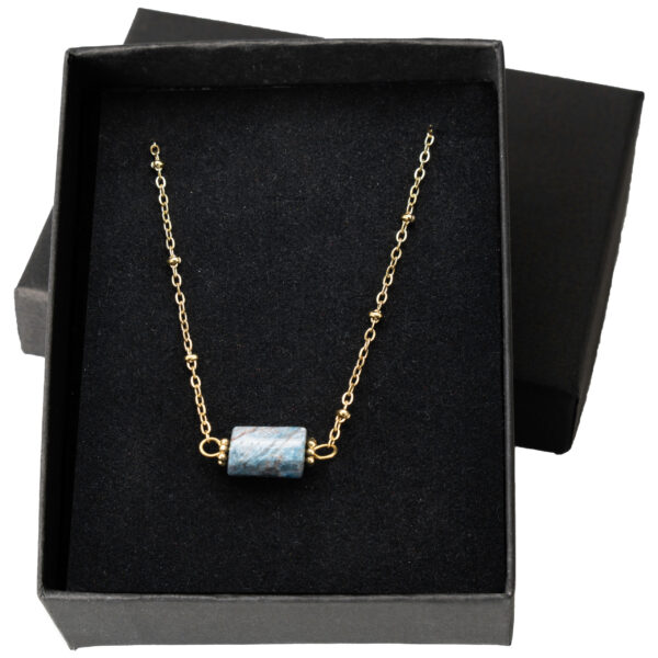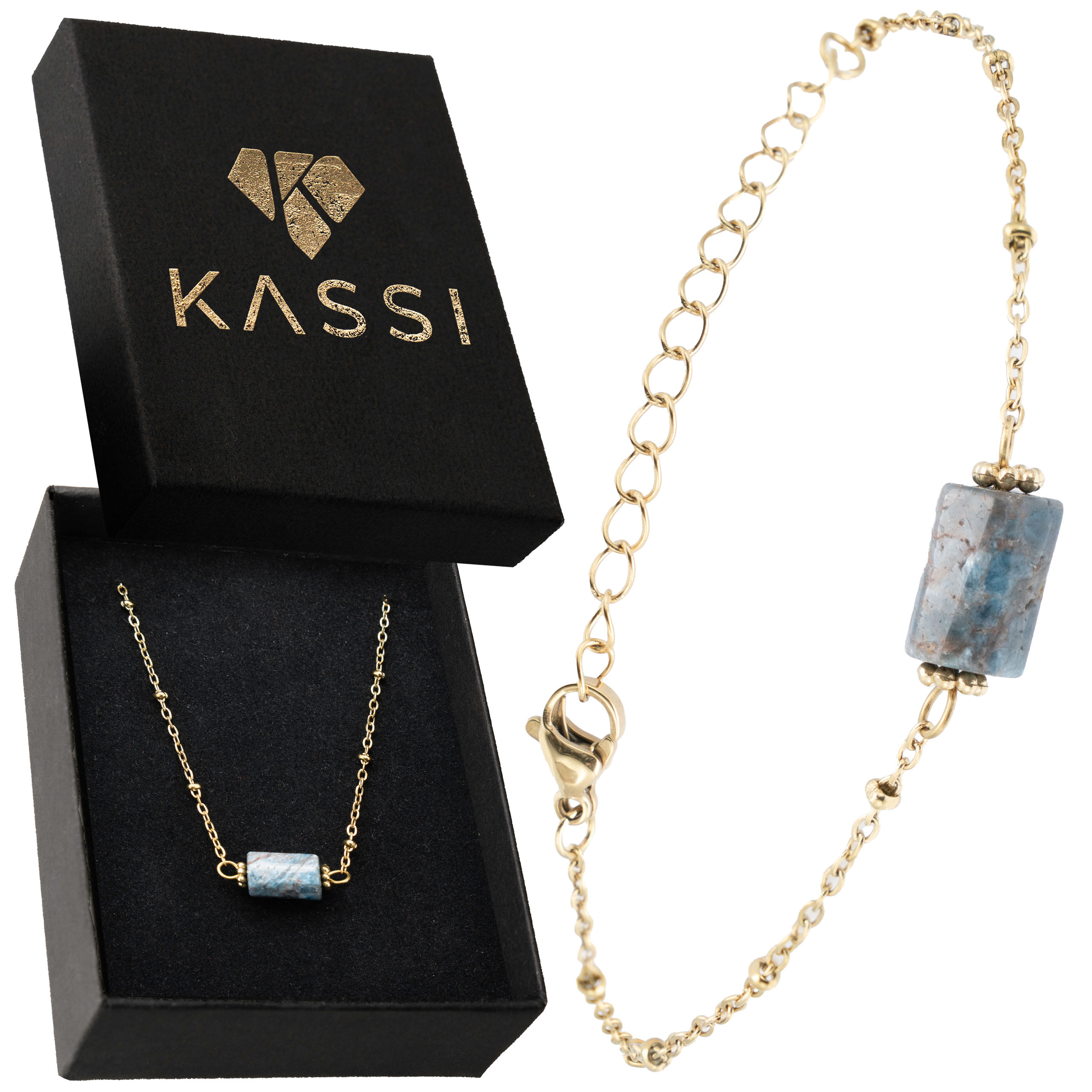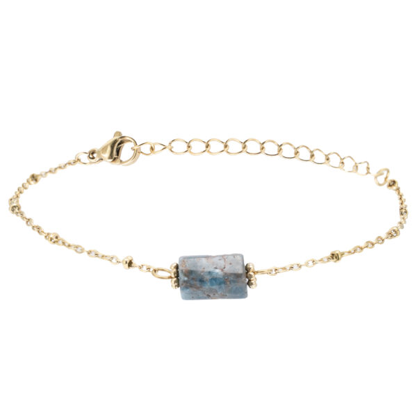 Ta wyrafinowana bransoletka łączy w sobie ponadczasową elegancję z naturalnym pięknem. Wykonana z pozłacanej stali chirurgicznej, znanej z trwałości i odporności na działanie czynników zewnętrznych, stanowi idealny wybór dla osób poszukujących biżuterii o wysokiej jakości. Centralnym elementem jest naturalny kamień apatyt – ręcznie oszlifowany, o delikatnym niebiesko-zielonym odcieniu z subtelnymi wzorami, który dodaje bransoletce wyjątkowego charakteru. Lekki, regulowany łańcuszek z precyzyjnym zapięciem oraz ozdobnymi złotymi koralikami zapewnia idealne dopasowanie i podkreśla jej wyrafinowany styl. To doskonały dodatek zarówno na co dzień, jak i na specjalne okazje, który z łatwością uzupełni każdą stylizację, dodając jej nuty naturalnego wdzięku i klasy.