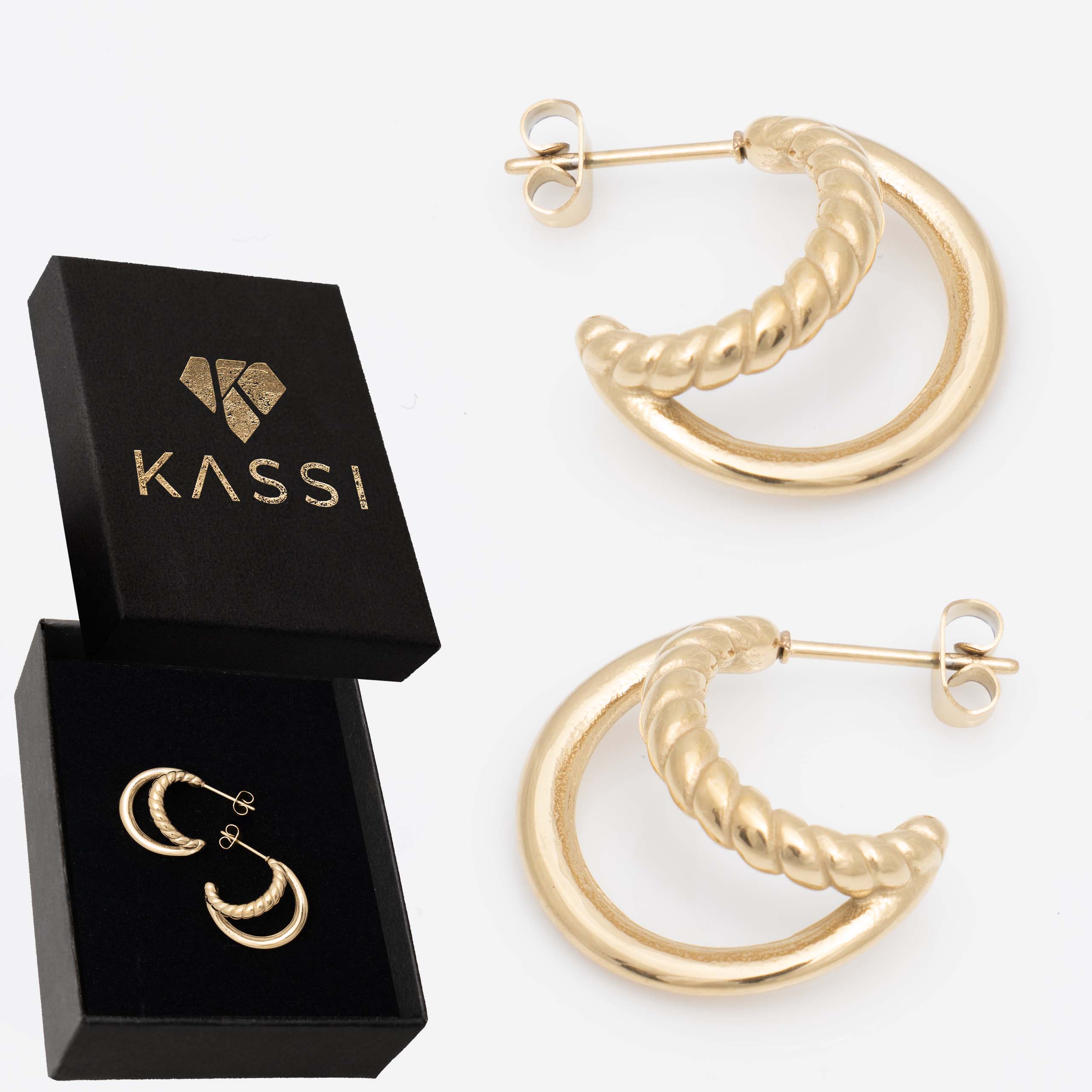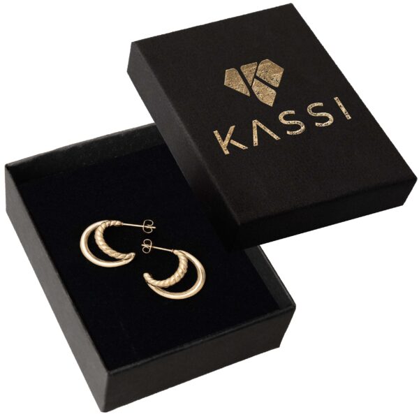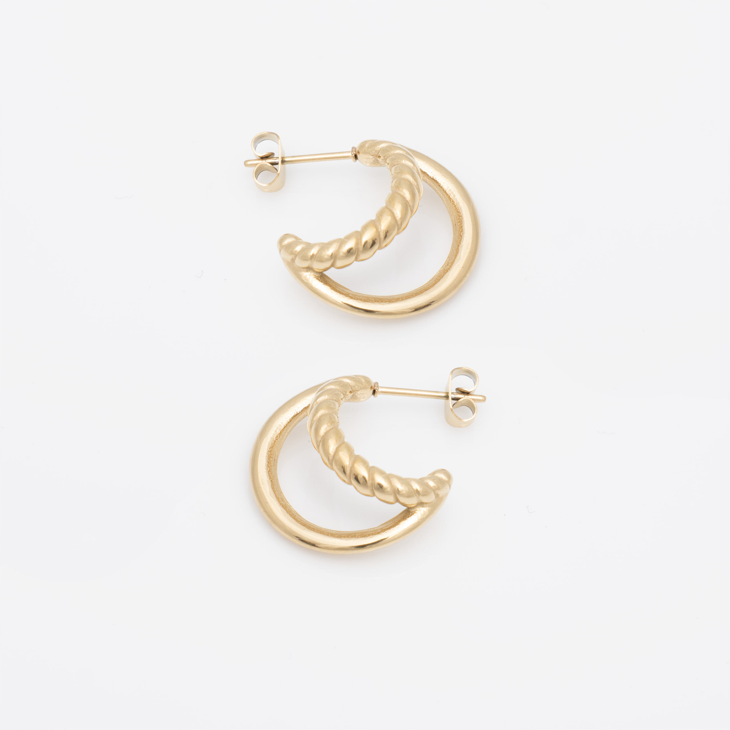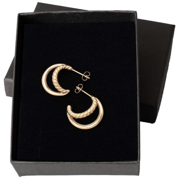 Stylowe pozłacane kolczyki kółka ze stali chirurgicznej z delikatnym, plecionym wzorem rope. Ich subtelny rozmiar i elegancki skręcony design sprawiają, że są uniwersalne i bardzo kobiece.