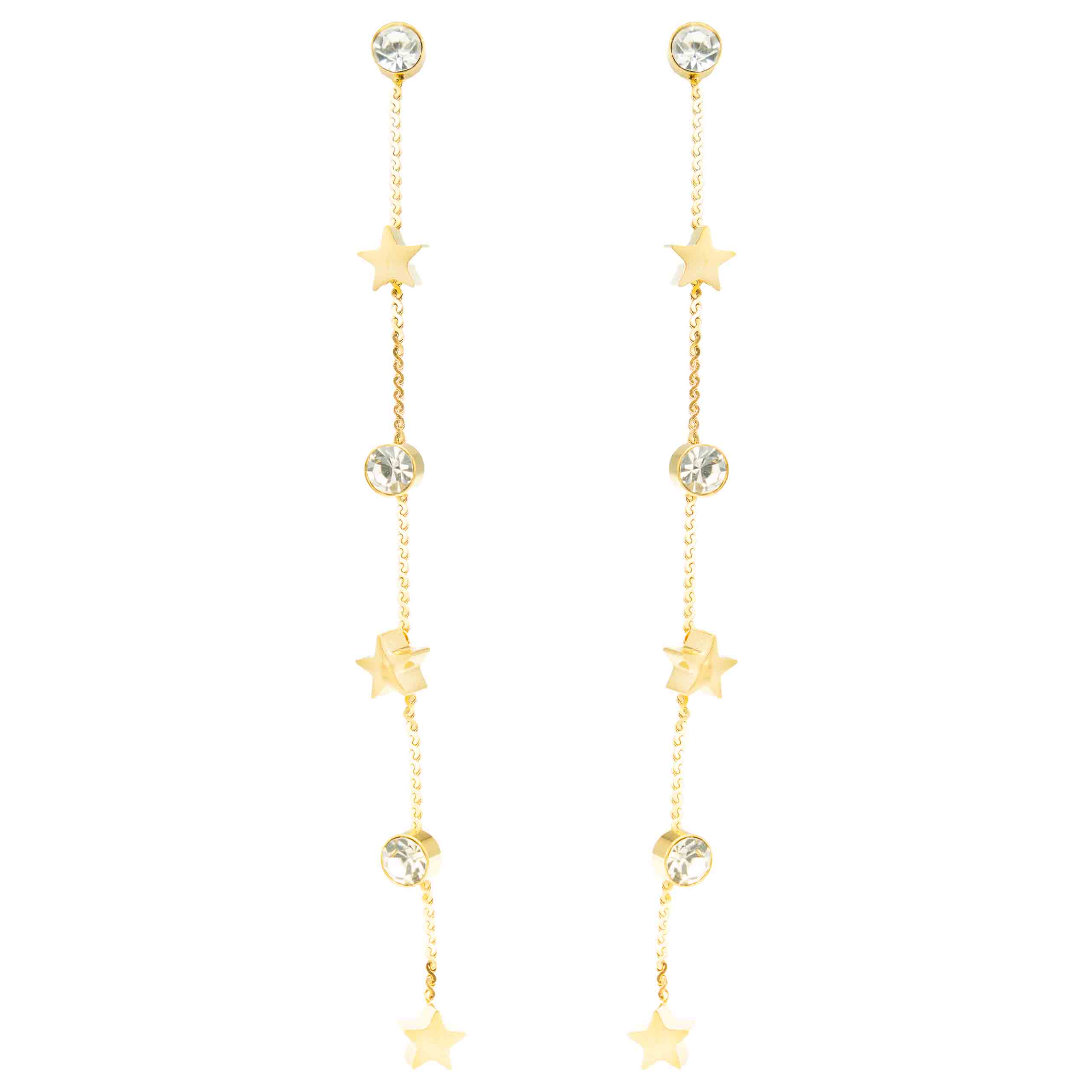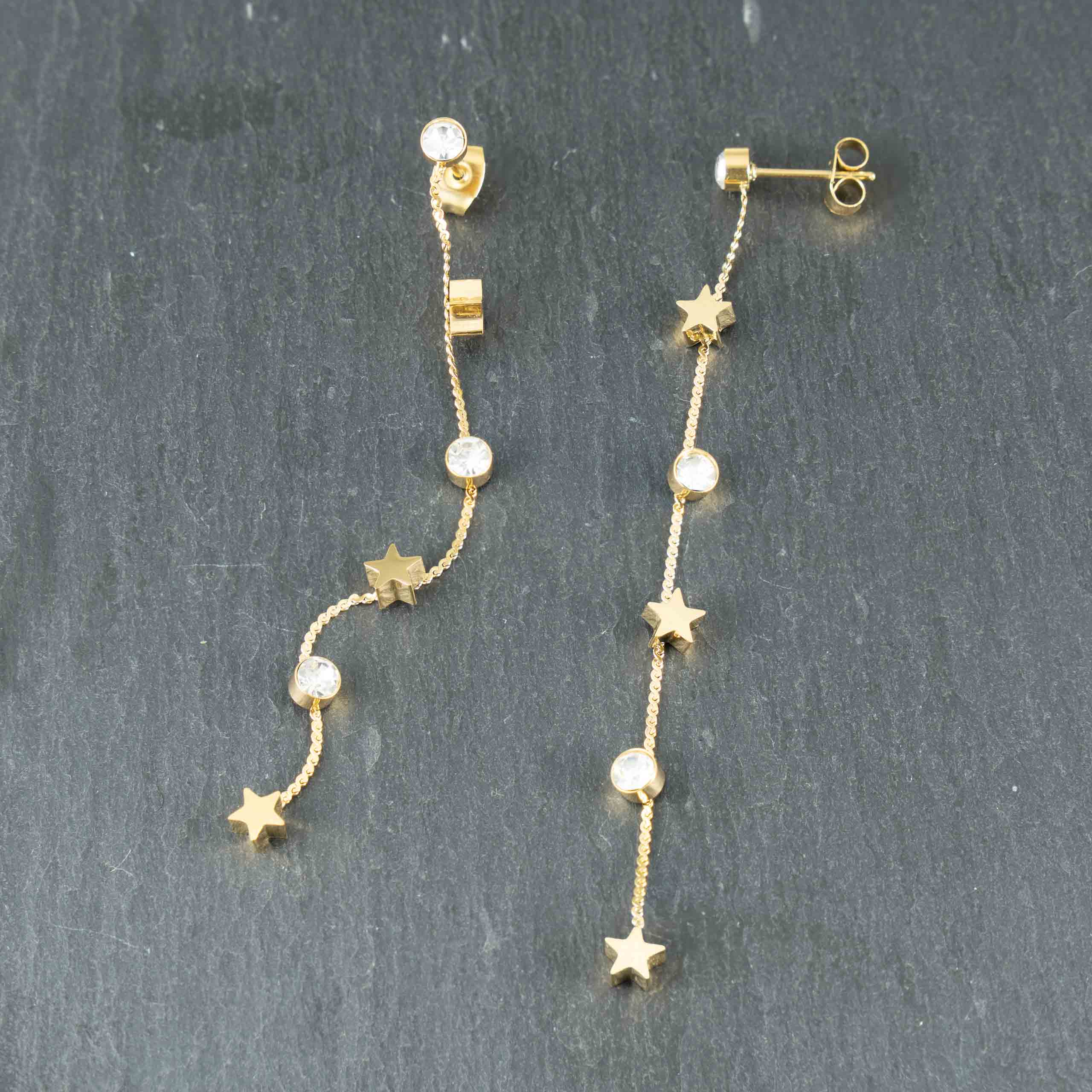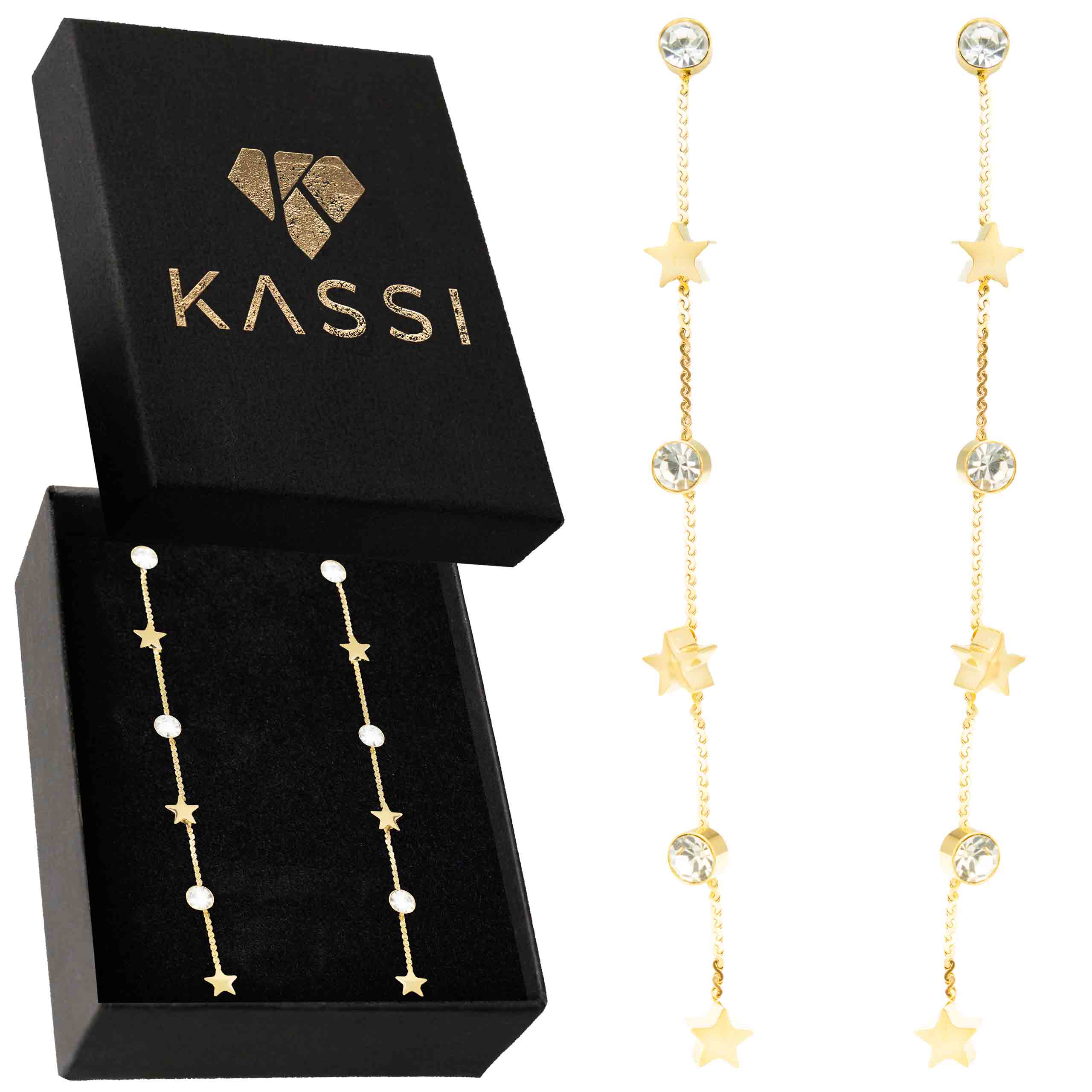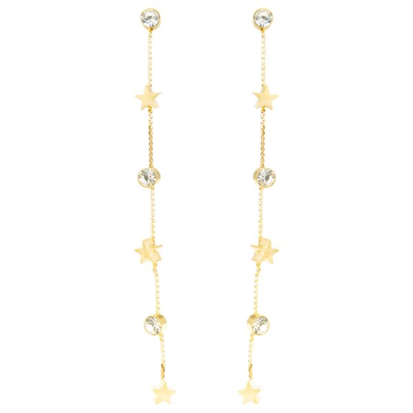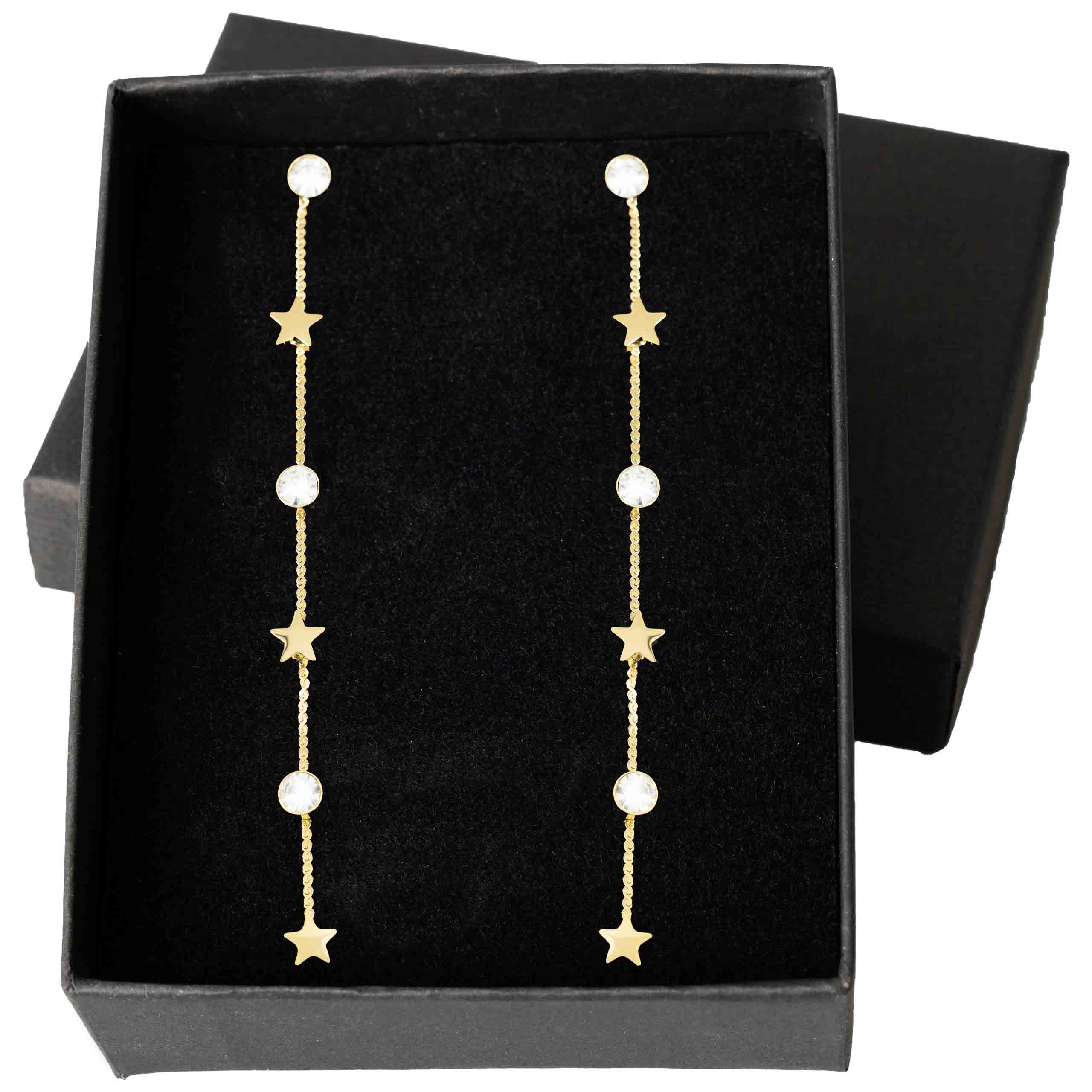 Pozłacane kolczyki ze sznurem, cyrkoniami i gwiazdkami to wyjątkowy dodatek, który łączy elegancję z nowoczesnym stylem. Trwałe i stylowe, idealnie sprawdzą się na specjalne okazje. Szybka wysyłka w eleganckim opakowaniu!