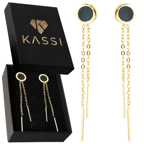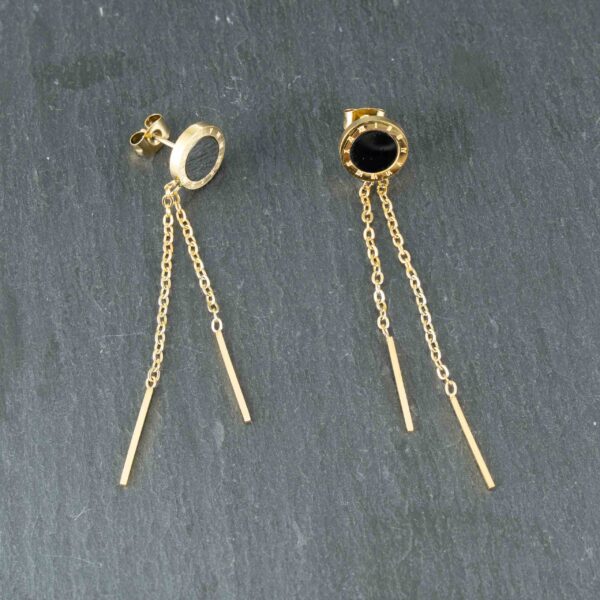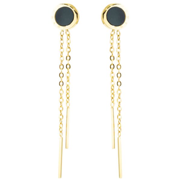 to połączenie nowoczesnego designu i klasycznej elegancji. Wyróżniają się minimalistyczną formą – czarne oczko osadzone w złotym kole oraz finezyjne, zwisające łańcuszki zakończone prostymi prętami tworzą niezwykle efektowną kompozycję.