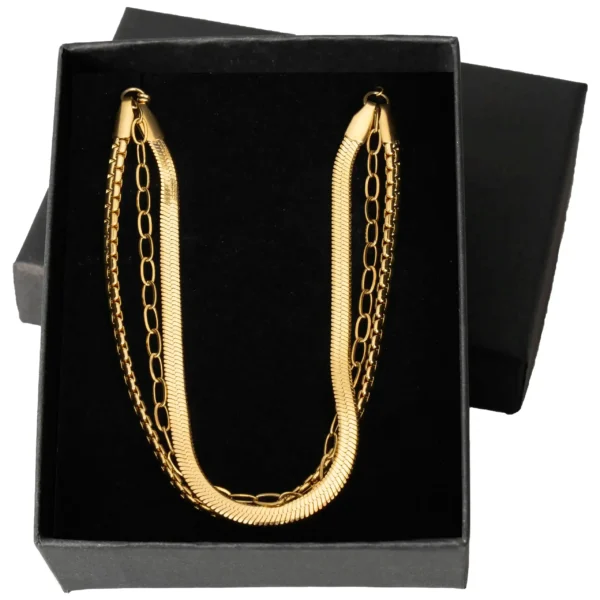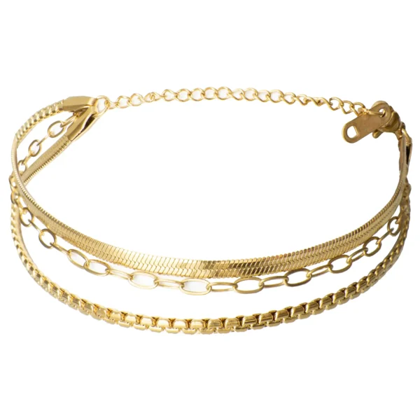 Dodaj odrobinę wyrafinowania do swojej kolekcji biżuterii dzięki tej olśniewającej bransoletce pozłacanej, wykonanej z wysokiej jakości stali szlachetnej. Jej wielowarstwowy design to prawdziwa perełka – łączy w sobie subtelny splot pancerki z delikatnym łańcuszkiem o eliptycznych ogniwach, tworząc harmonijną i nowoczesną kompozycję. Złocisty odcień bransoletki pięknie mieni się w świetle, dodając blasku zarówno codziennym, jak i wieczorowym stylizacjom.