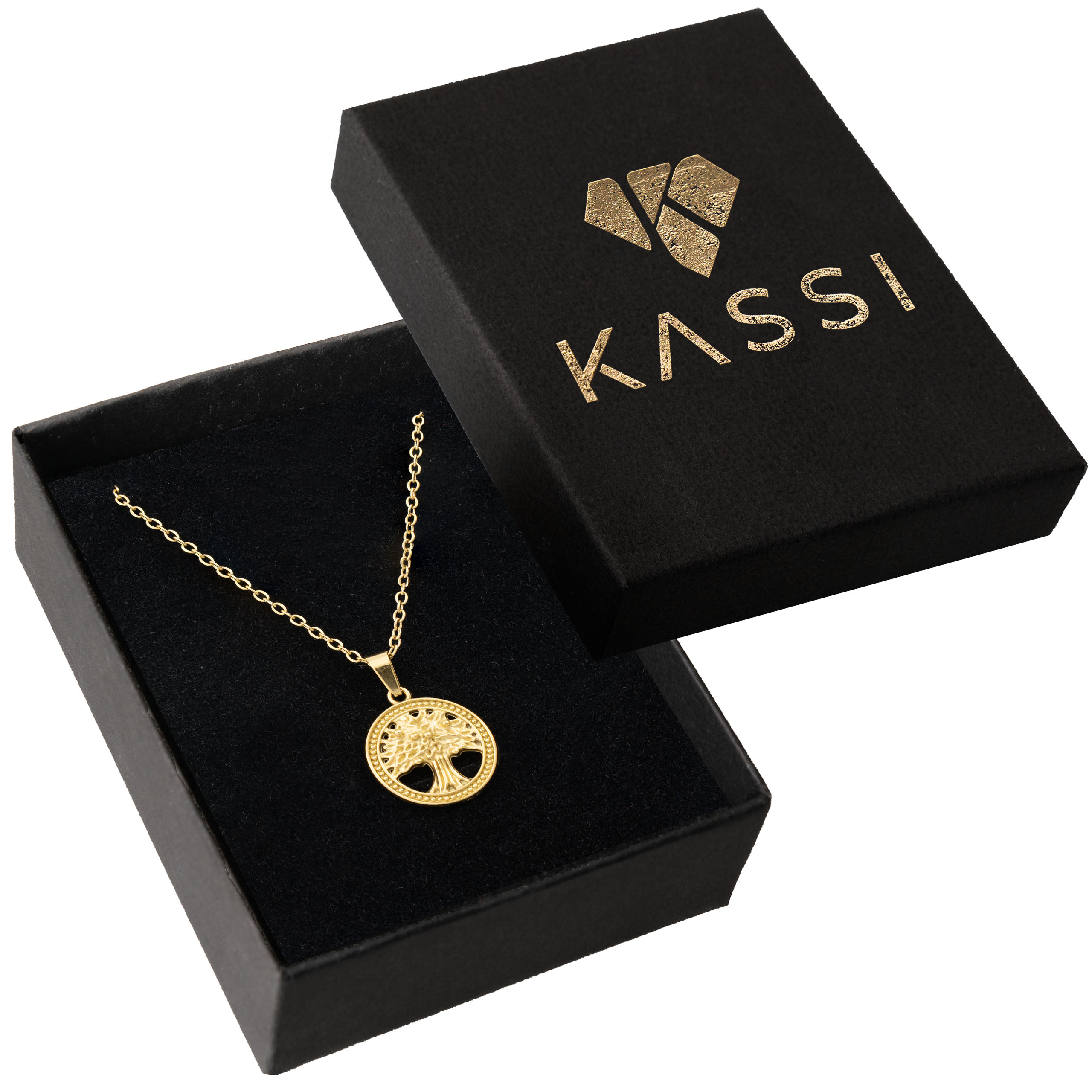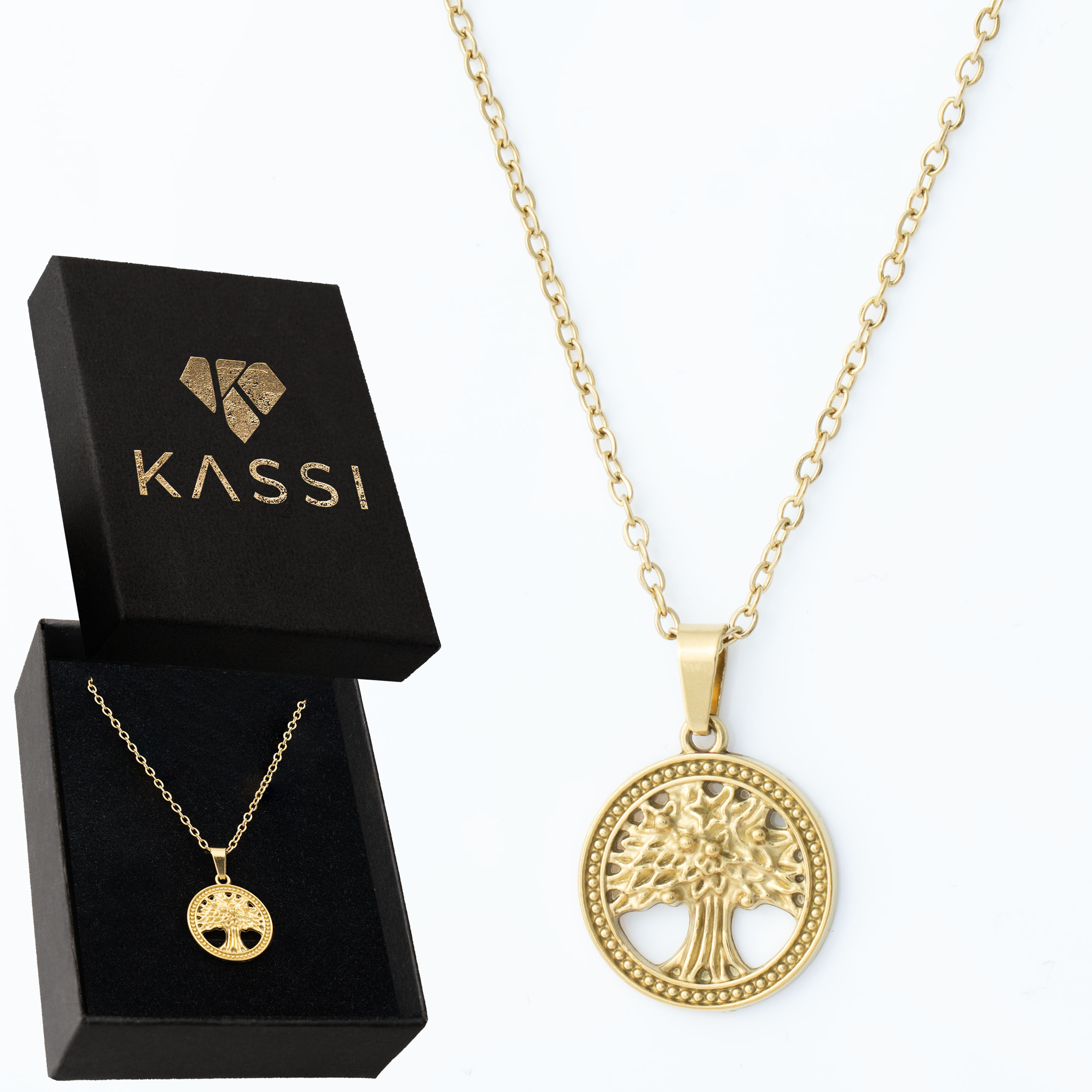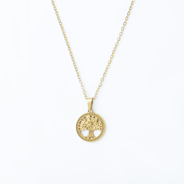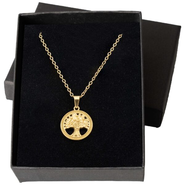 Naszyjnik, który emanuje spokojem i elegancją – ciepłe złoto otacza ażurowe drzewo życia otoczone delikatnym blaskiem. Stal 316L z trwałą złotą powłoką – lekki, wyważony i wygląda jak biżuteria z wyższej półki.