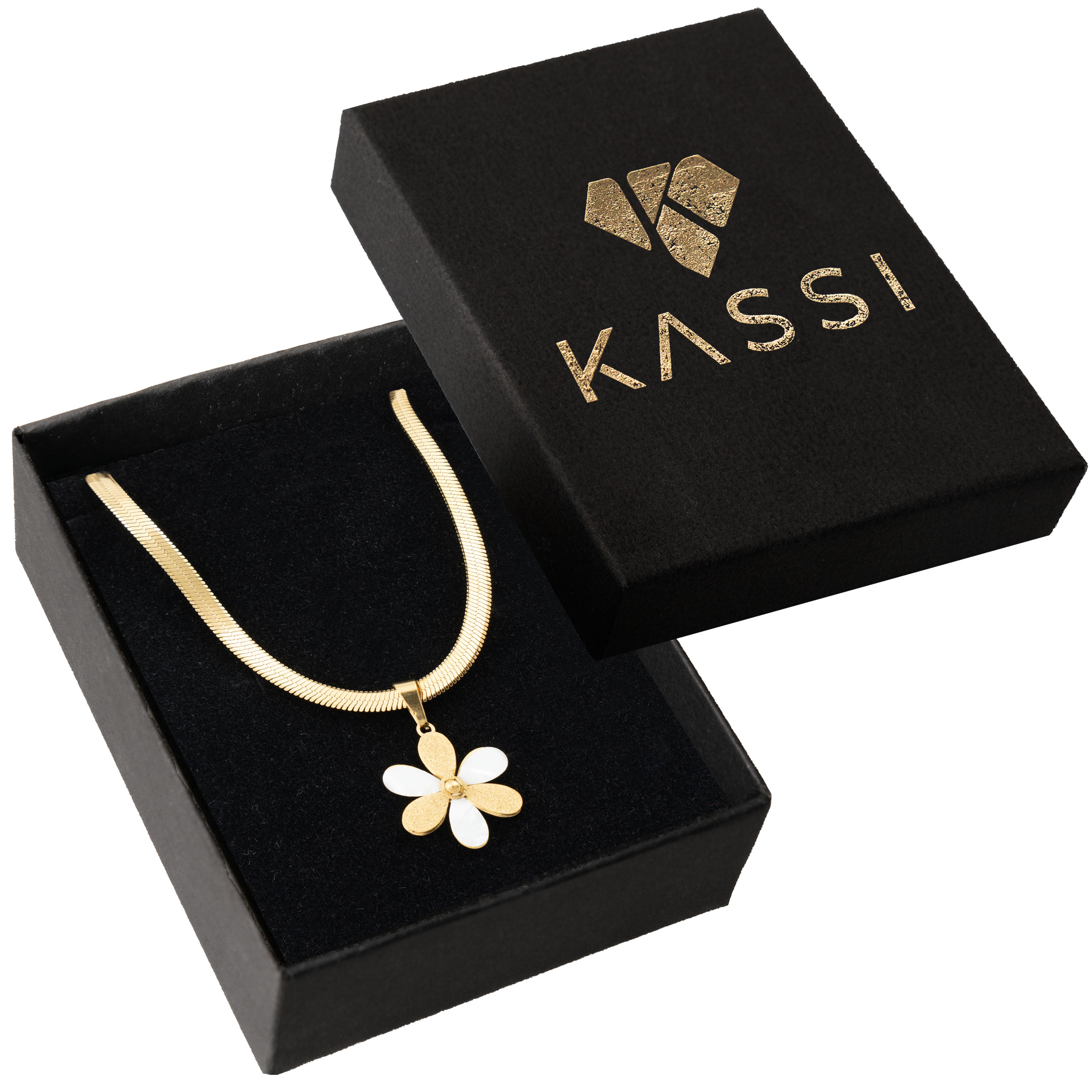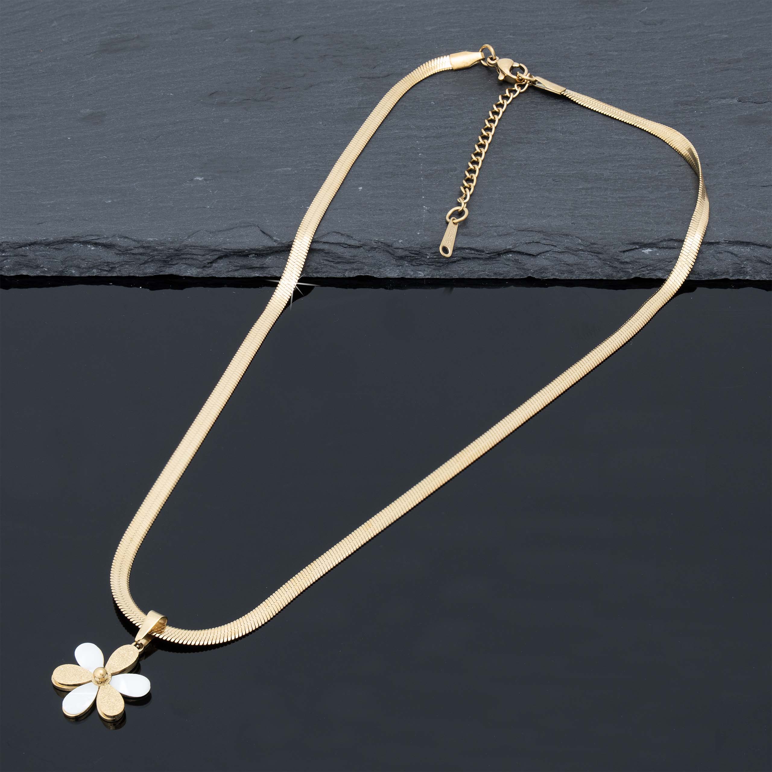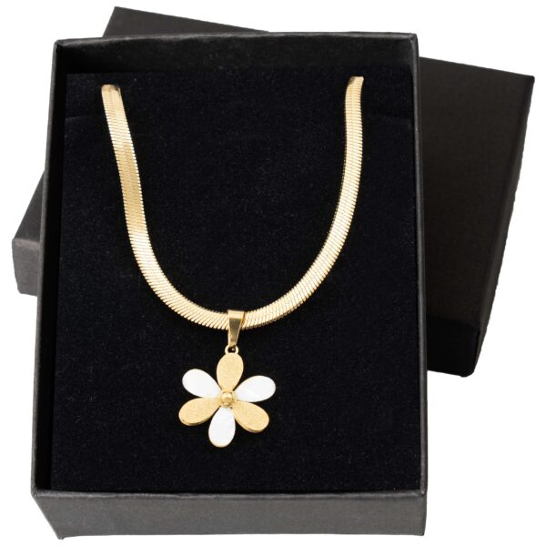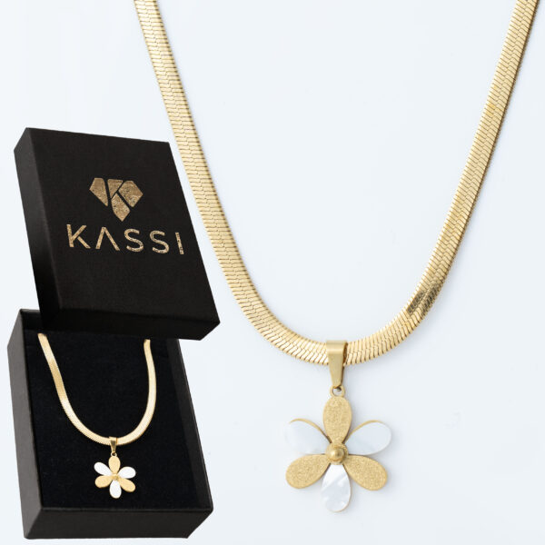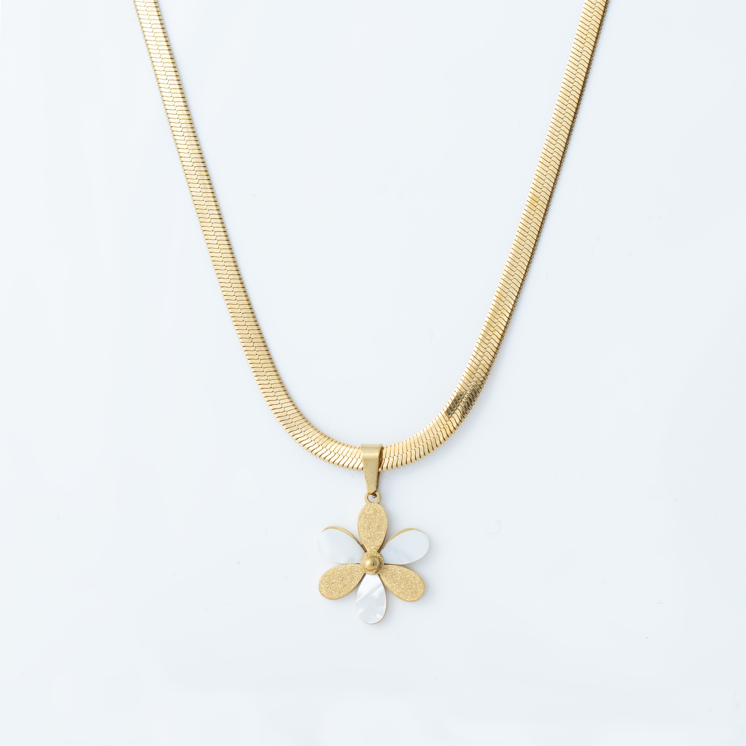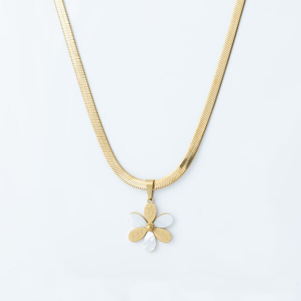 Naszyjnik, który wygląda jak mały skarb znaleziony na plaży – ciepła złota oprawa otacza błyszczącą perłę w kształcie pięciopłatkowego kwiatka. Stal 316L z trwałą złotą powłoką – lekki, wygodny i emanuje subtelnym, letnim luksusem.