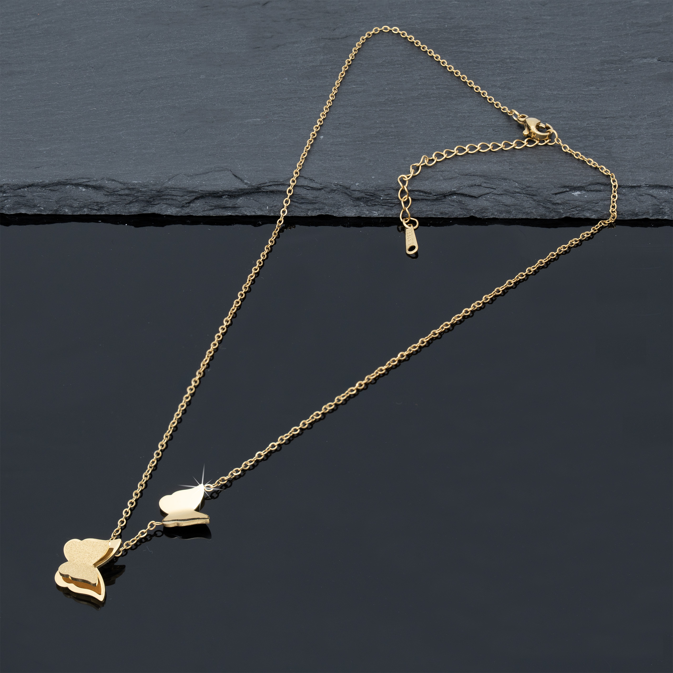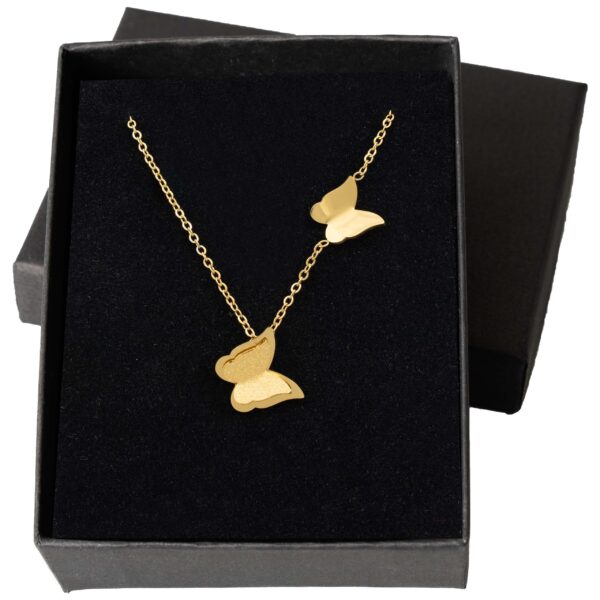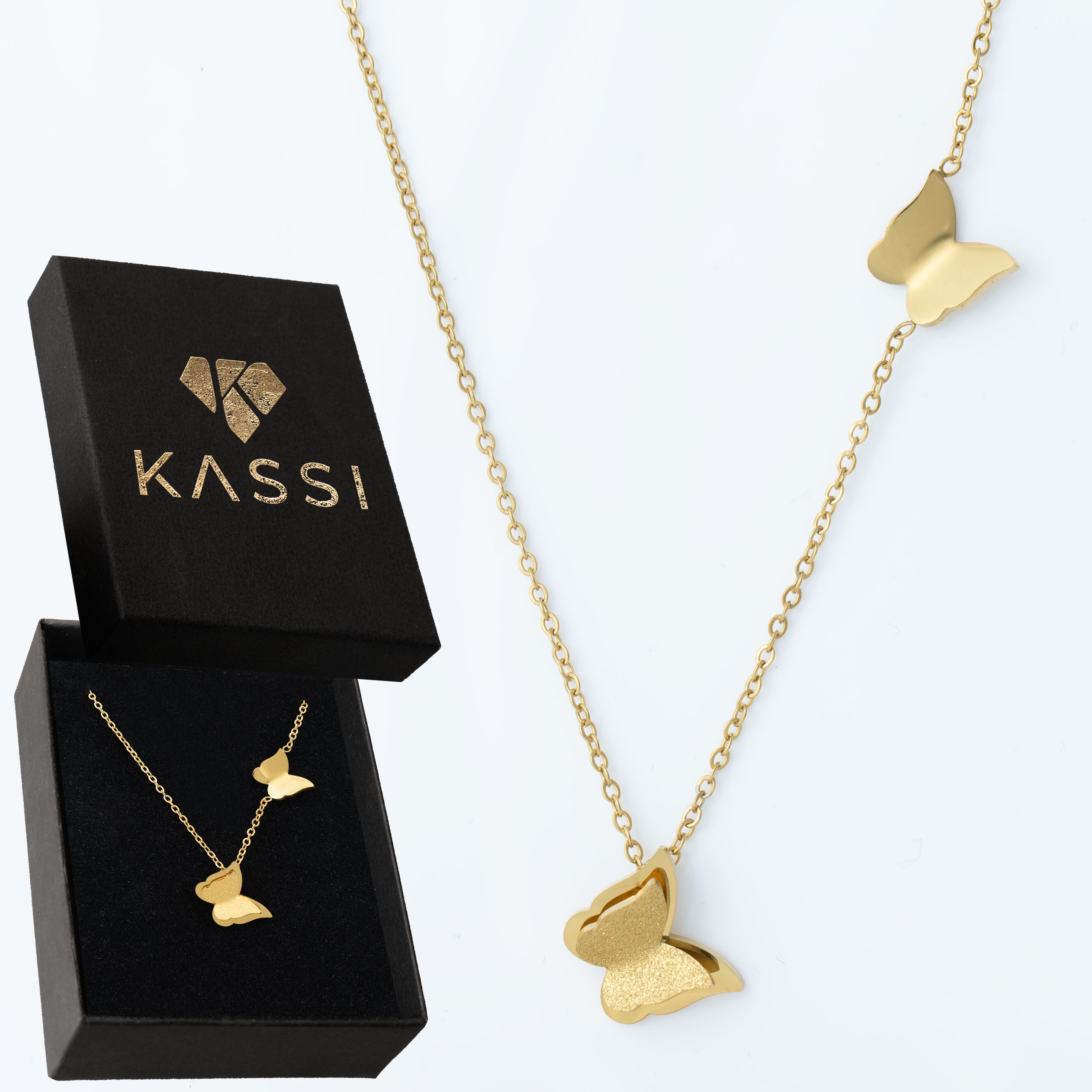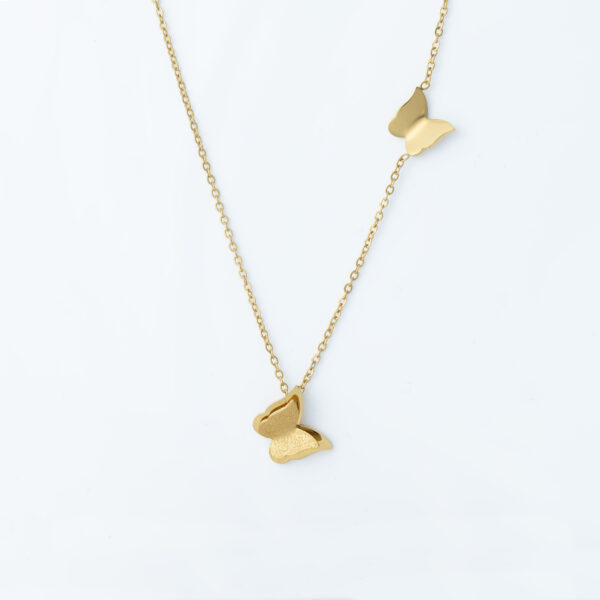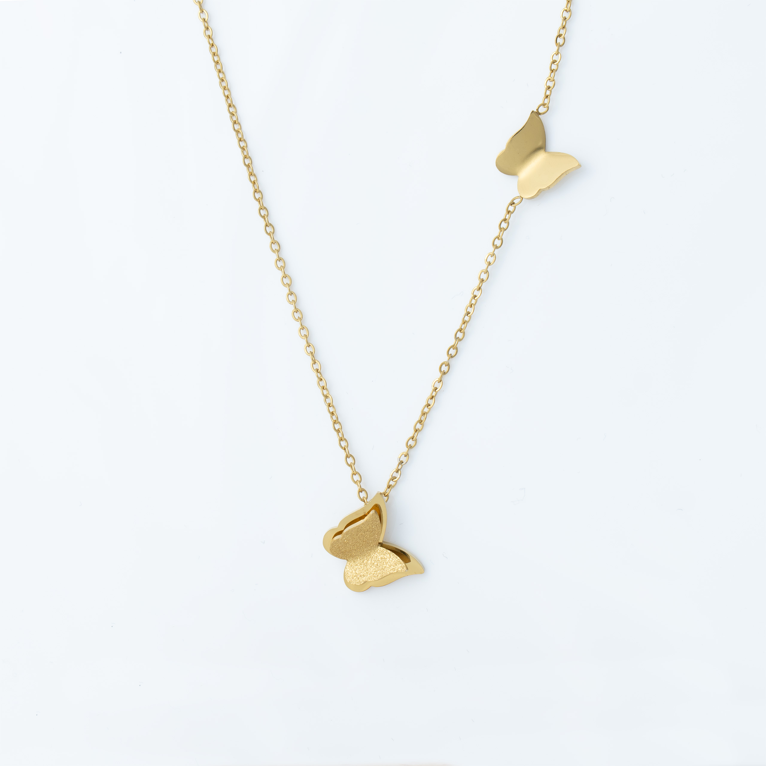 Naszyjnik, który wygląda jak dwa złote motyle unoszące się na szyi – delikatny, romantyczny i bardzo kobiecy. Stal 316L z ciepłą złotą powłoką – praktycznie niewyczuwalny, a przy tym elegancki i pełen uroku.