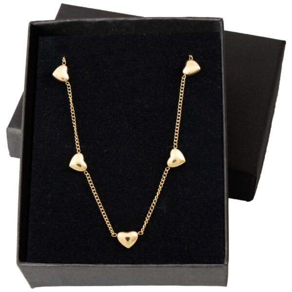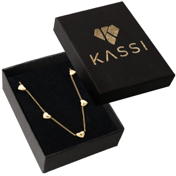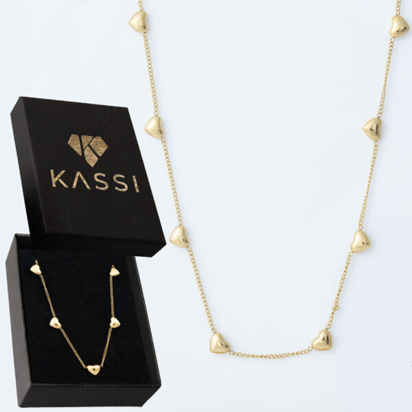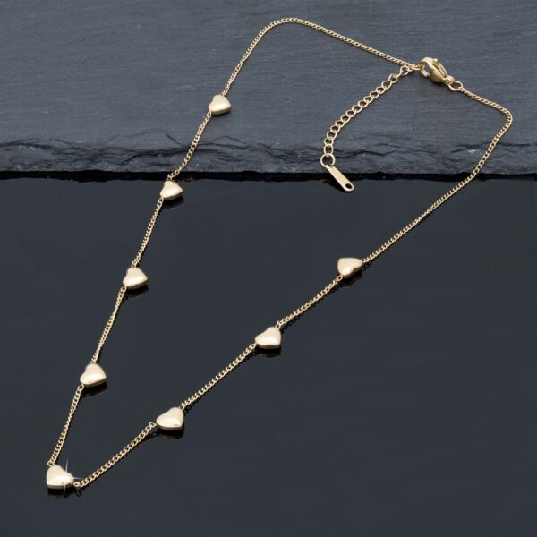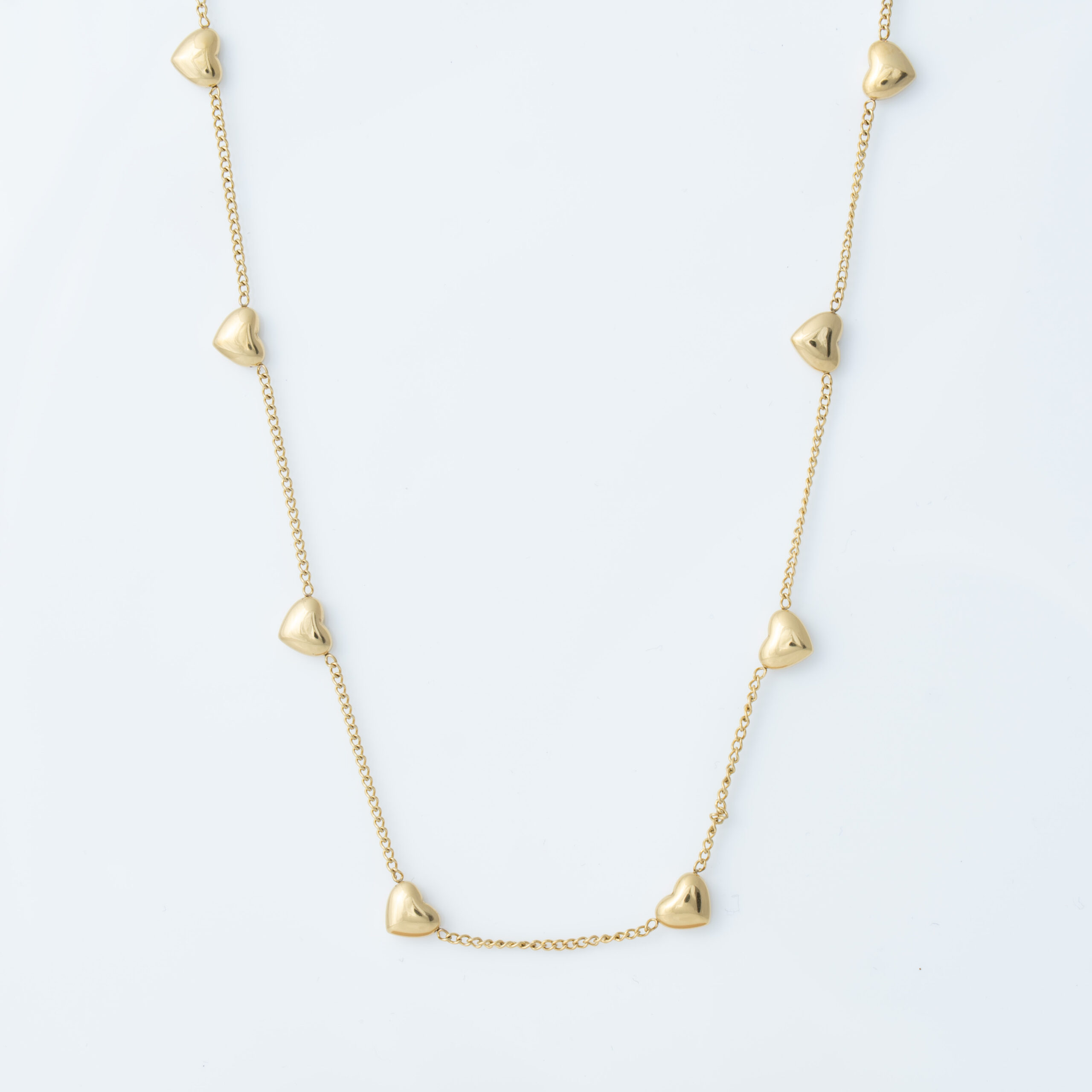 Naszyjnik, który wygląda jak złote serca rozsypane wzdłuż szyi – ciepły blask, delikatna konstrukcja i bardzo dziewczęcy charakter. Stal 316L z trwałą złotą powłoką – prawie niewyczuwalny na skórze, a efekt jest uroczy i zauważalny.