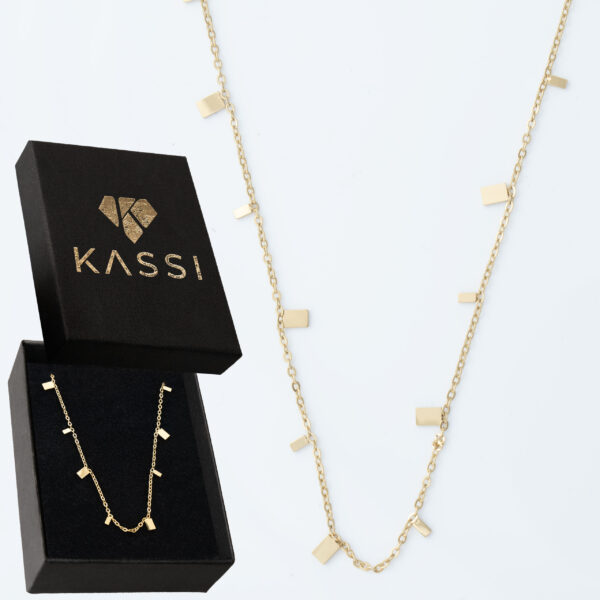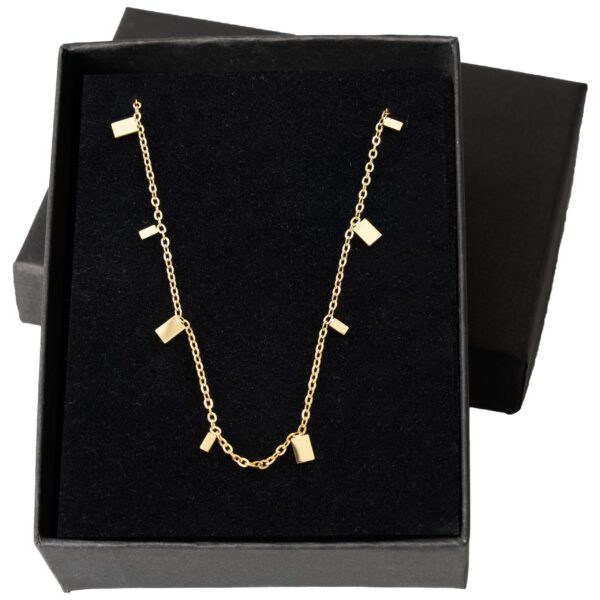 Naszyjnik, który wygląda jak złote nuty rozsypane na szyi – ciepły blask, delikatny łańcuszek i nieregularnie rozmieszczone, płaskie prostokąty. Stal 316L z trwałą złotą powłoką – prawie niewyczuwalny na skórze, a efekt jest naprawdę duży.