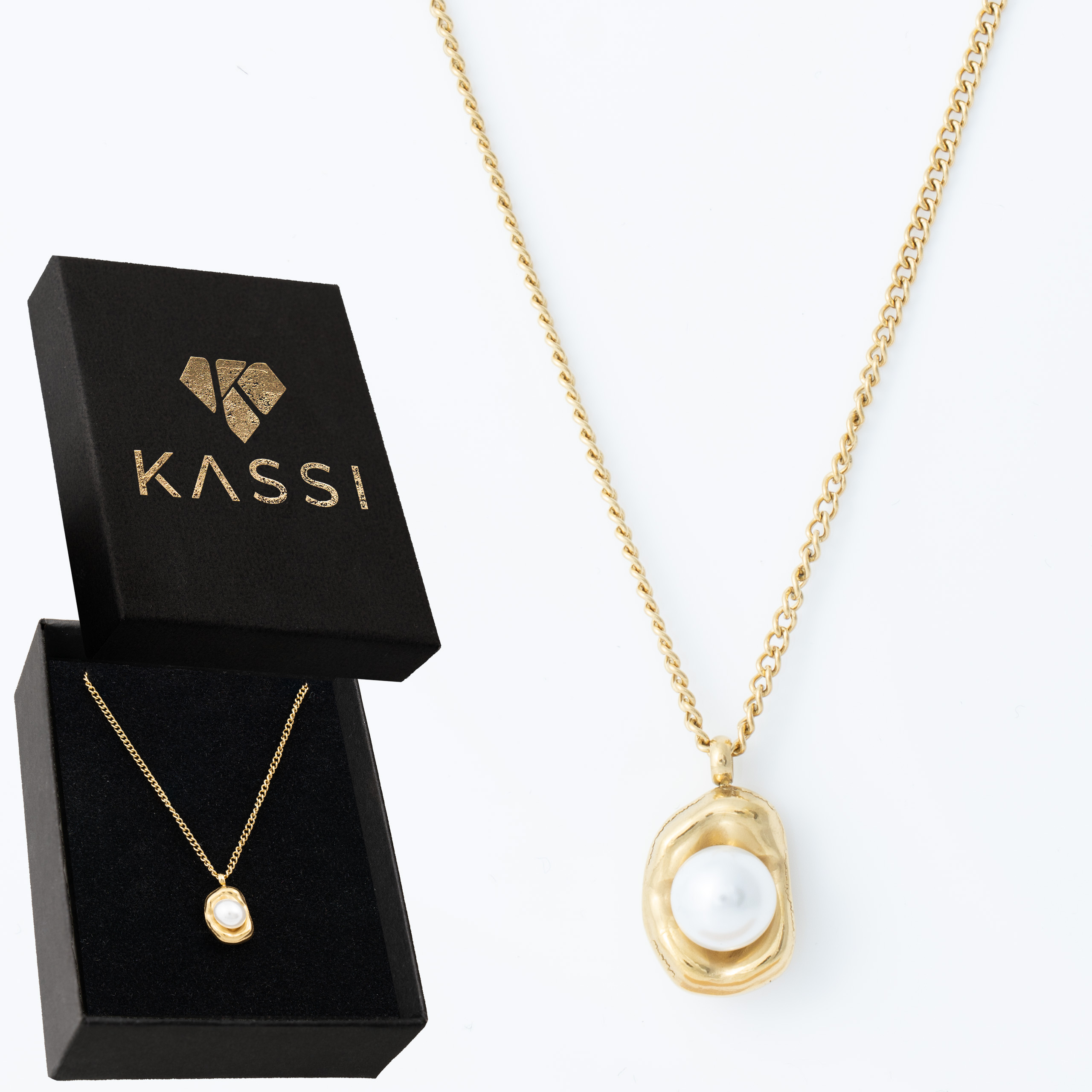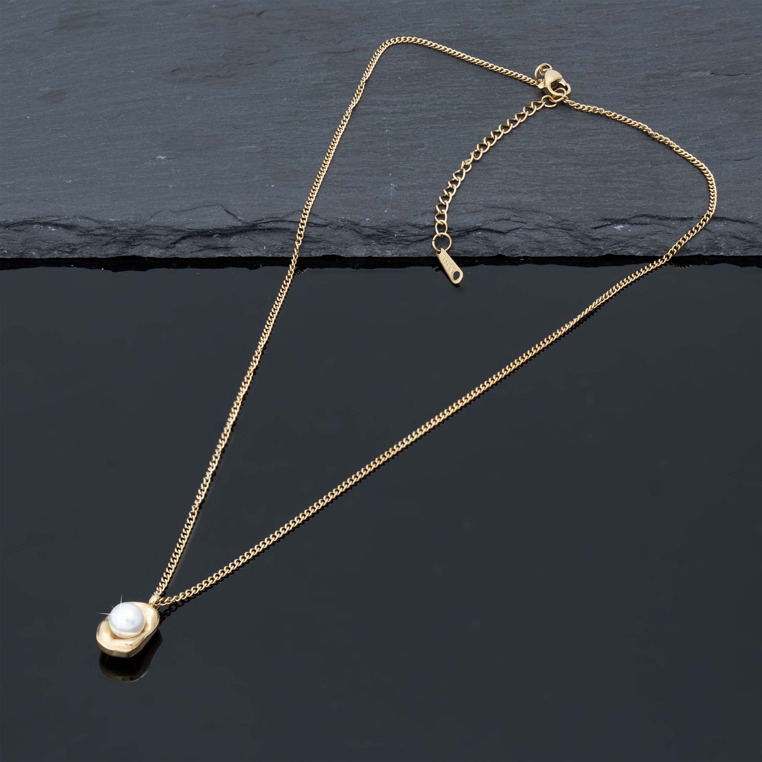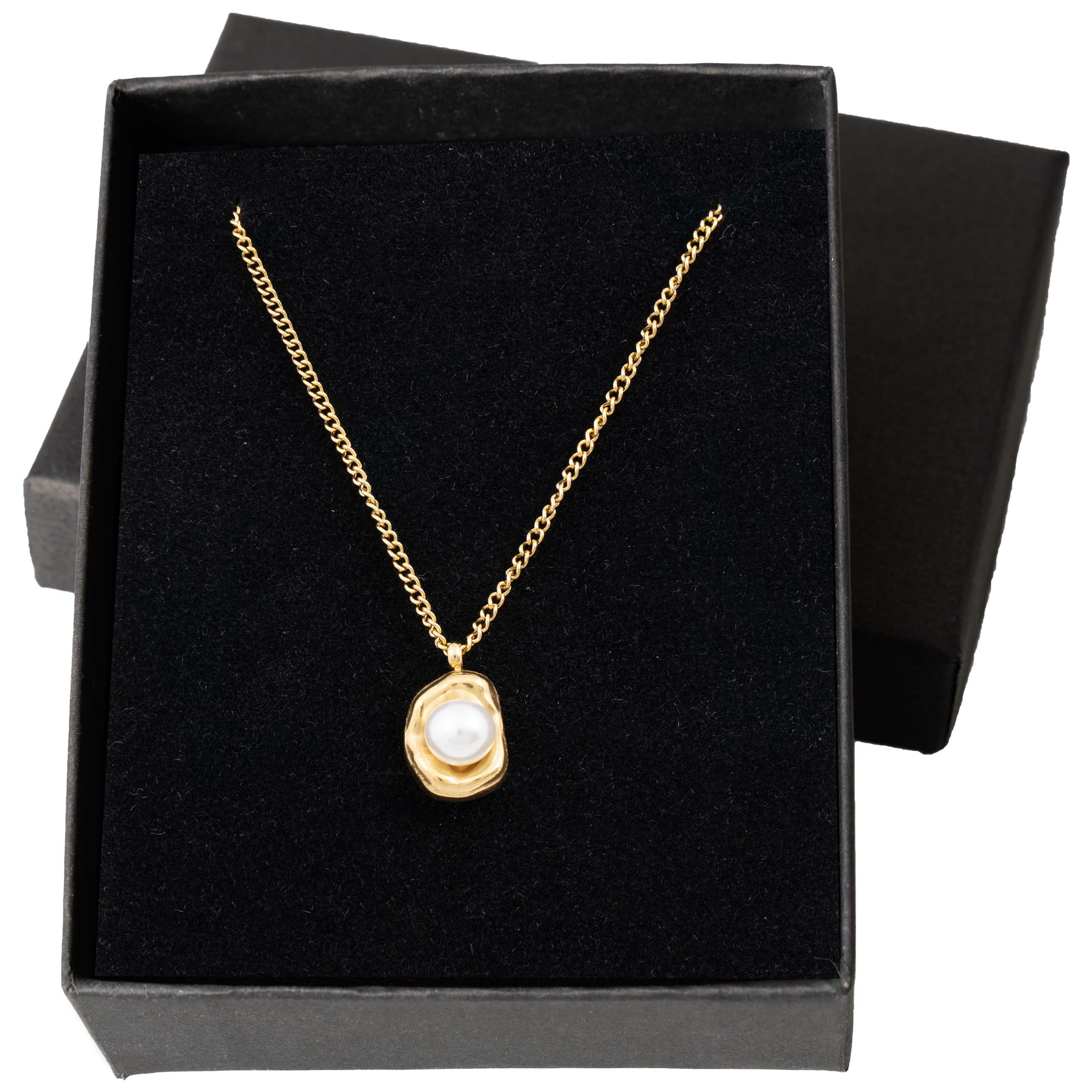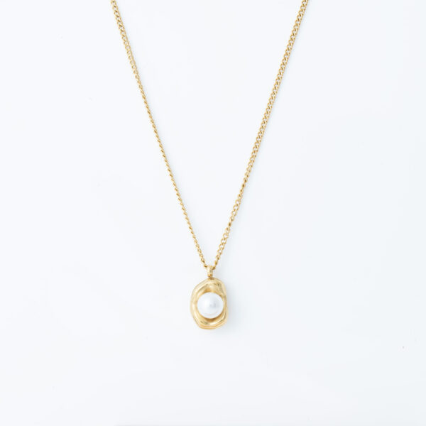 Naszyjnik, który wygląda, jakby powstał na plaży o wschodzie słońca – surowy, organiczny kształt otacza idealnie okrągłą perłę. Stal szlachetna 316L z ciepłą złotą powłoką, lekki i zaskakująco wygodny nawet przy całodniowym noszeniu.