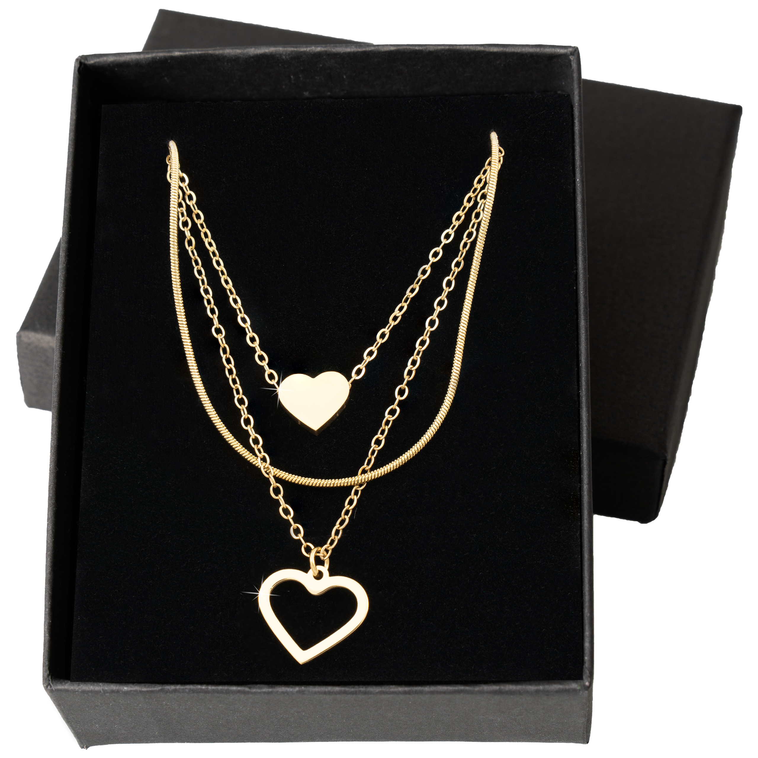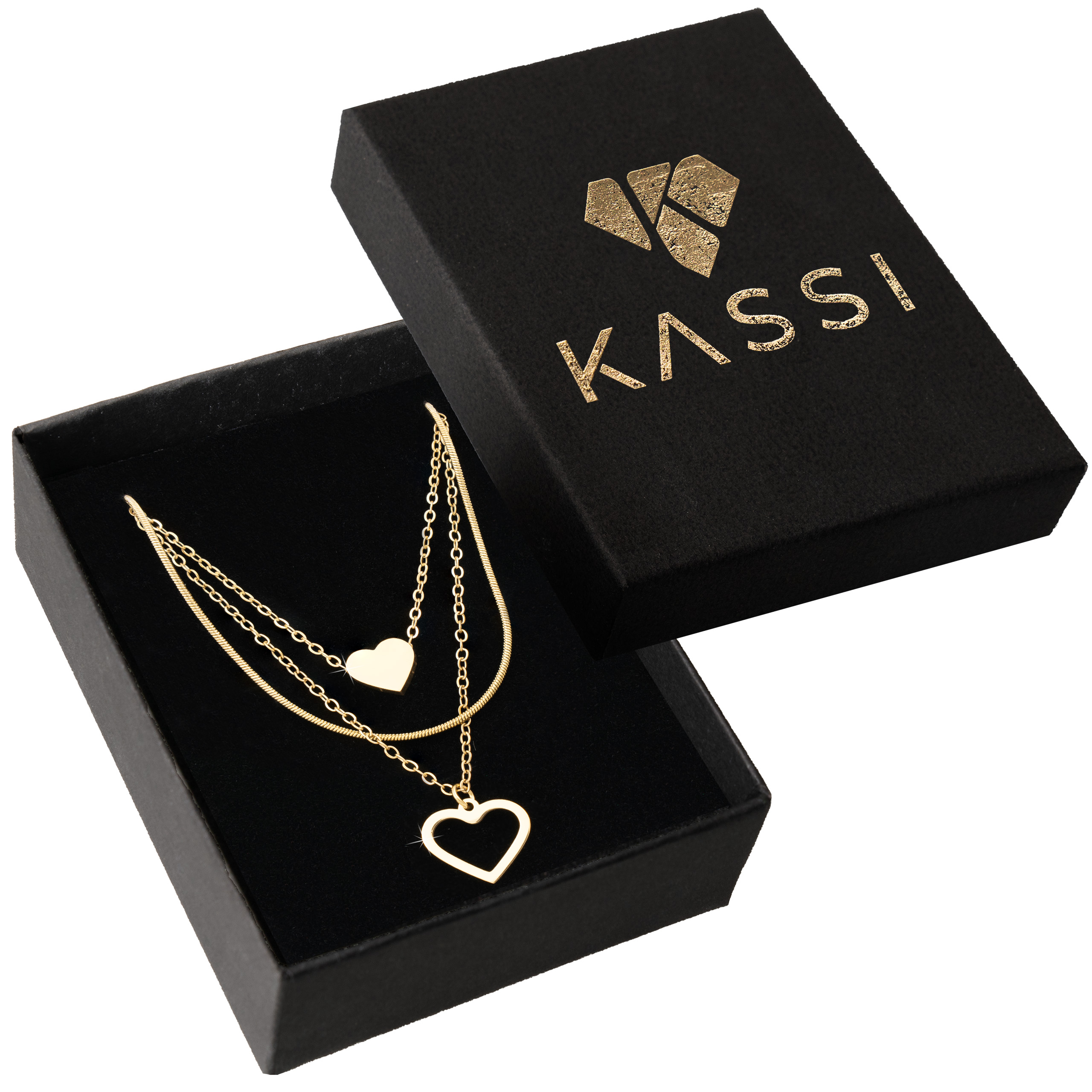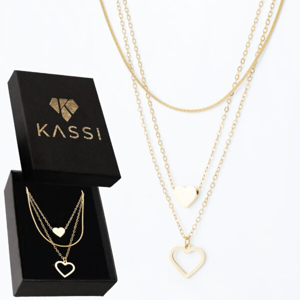 Potrójne łańcuszki + dwa różne serca dają efekt wow, ale bez przesady – biżuteria jest zauważalna, wygodna i uniwersalna. To jeden z tych modeli, które szybko stają się ulubione i noszone niemal codziennie przez cały rok.