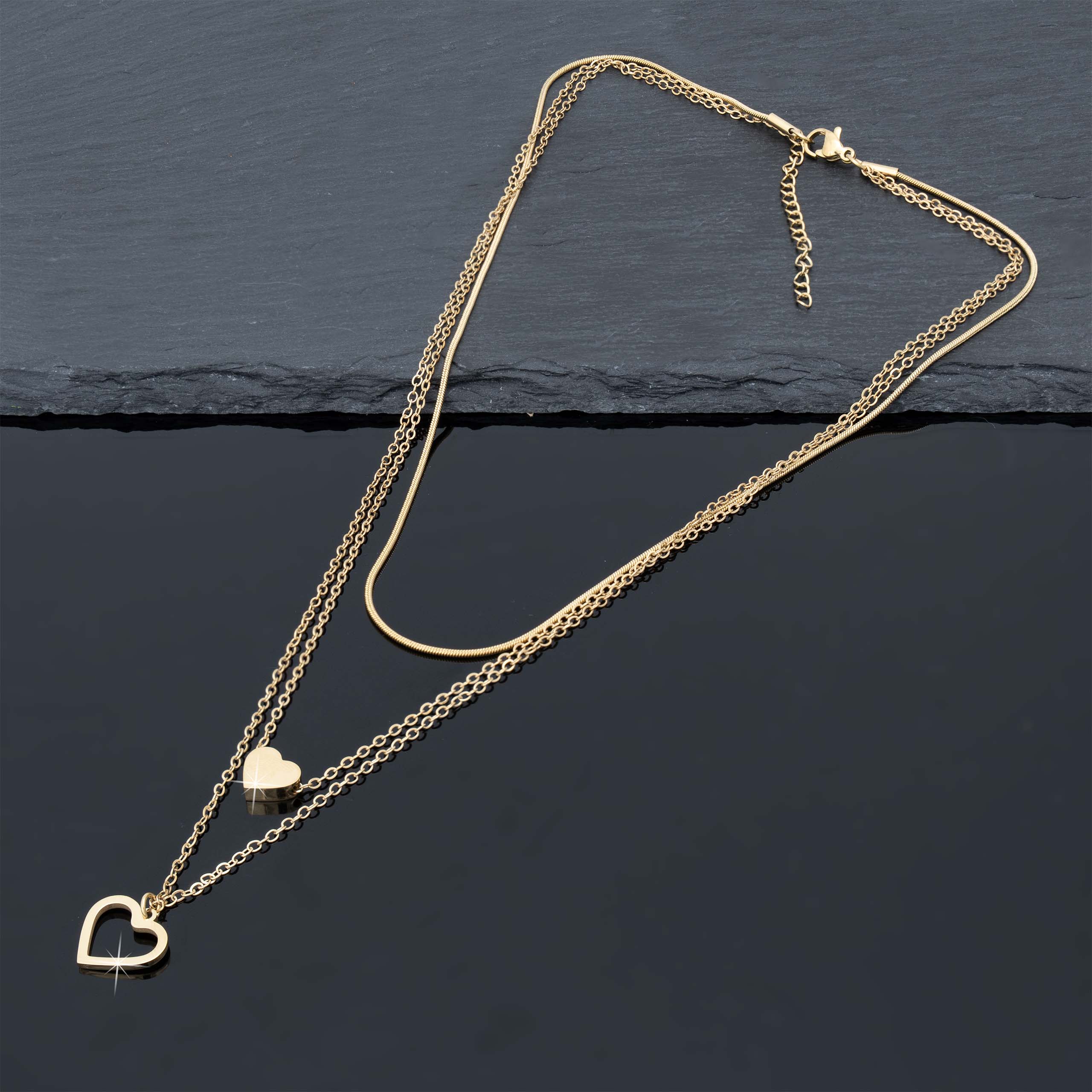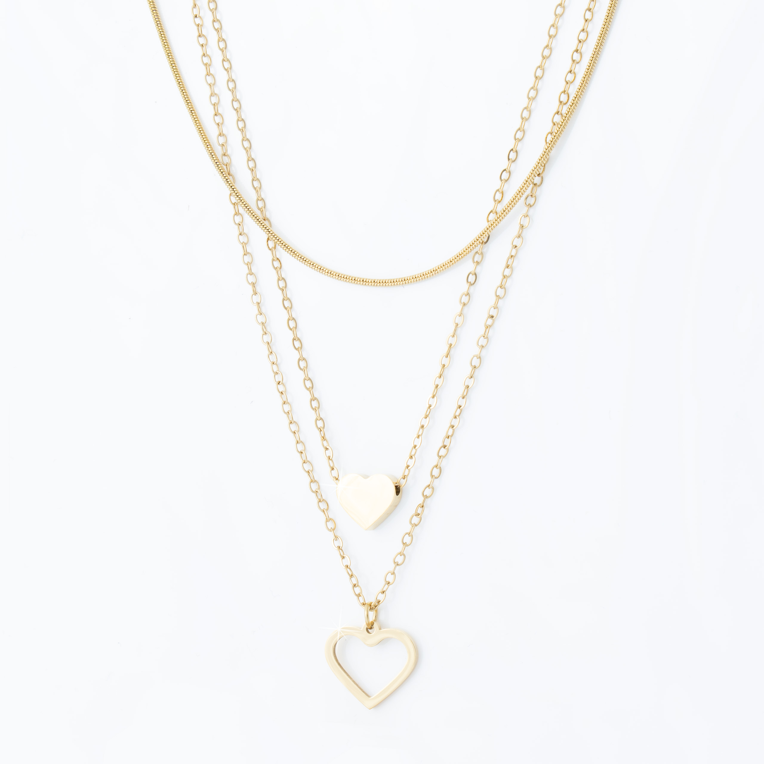 Strona główna | Sklep | Naszyjniki | Pozłacany naszyjnik stal chirurgiczna potrójny łańcuszek dwa serca ażurowe złote