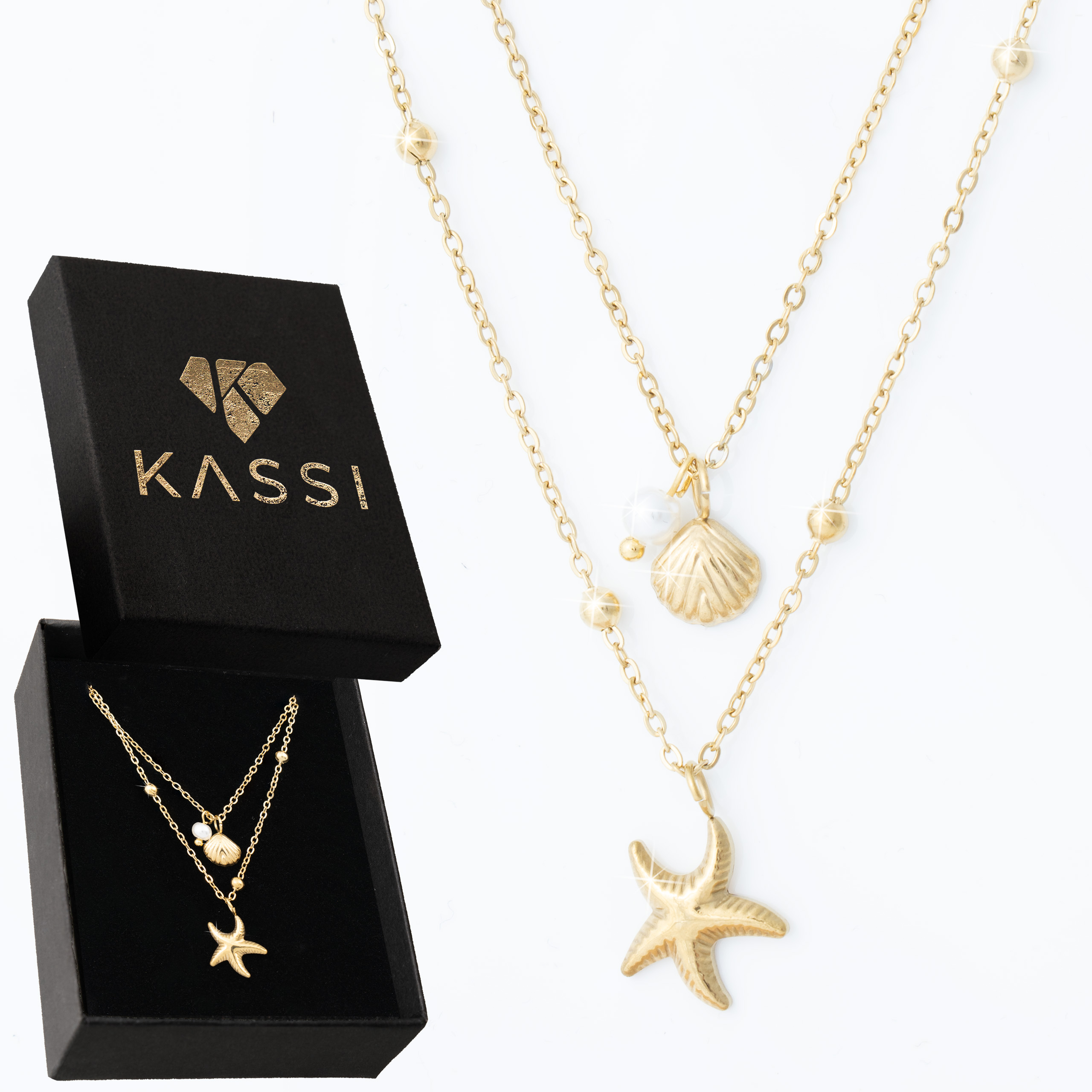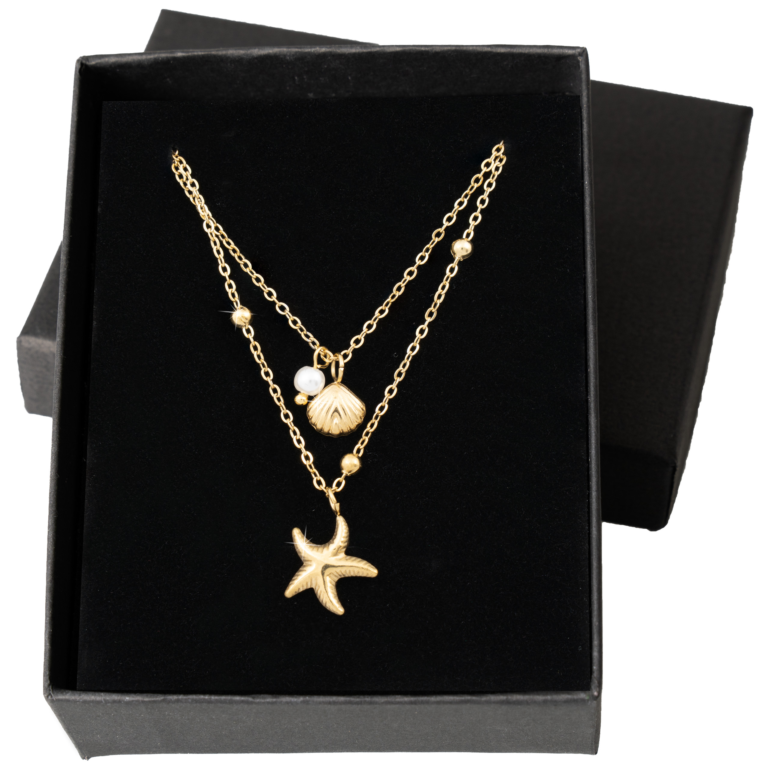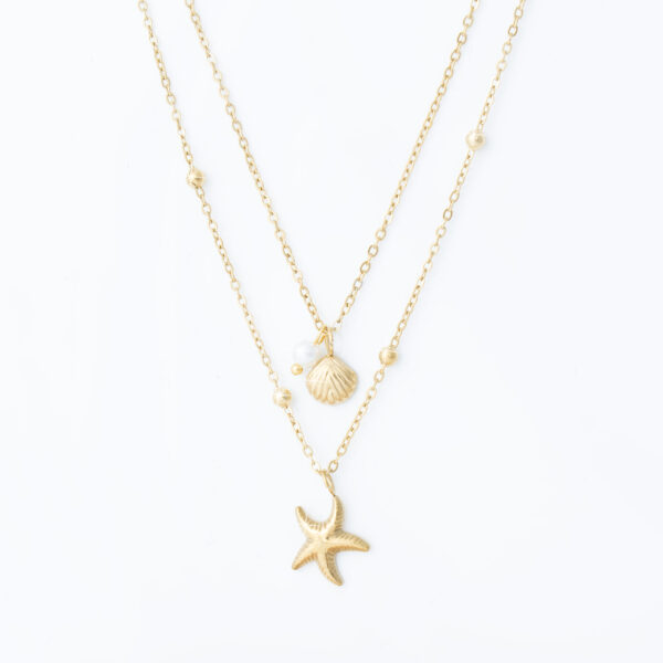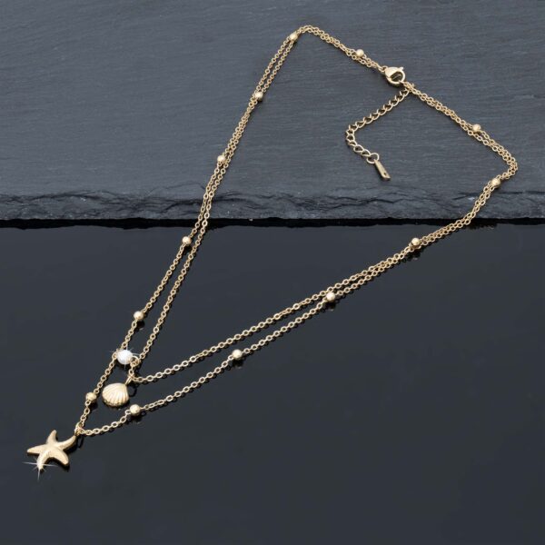 Strona główna | Sklep | Naszyjniki | Pozłacany naszyjnik stal chirurgiczna podwójny łańcuszek muszelka rozgwiazda perła