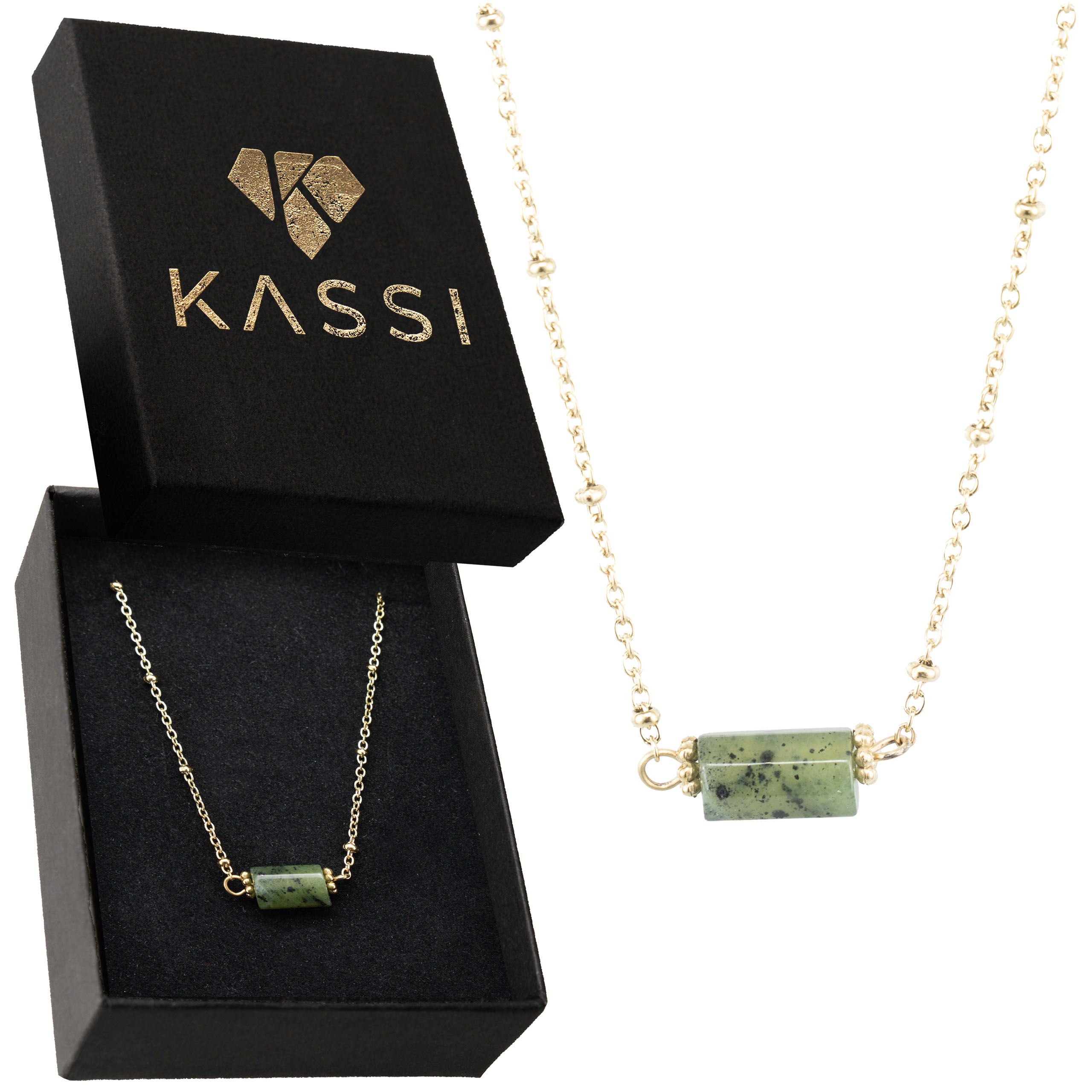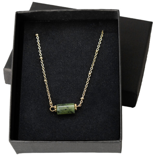 Ten harmonijny naszyjnik łączy elegancję z naturalnym pięknem, będąc idealnym wyborem dla osób ceniących ponadczasową biżuterię. Wykonany z pozłacanej stali chirurgicznej, która zapewnia trwałość i hipoalergiczne właściwości, gwarantuje komfort noszenia na co dzień. Centralnym punktem jest naturalny zielony jadeit – ręcznie oszlifowany kamień o głębokim, zielonym odcieniu, który symbolizuje spokój i równowagę. Regulowany łańcuszek z precyzyjnym zapięciem oraz subtelnymi złotymi akcentami pozwala na idealne dopasowanie, a jego klasyczny design pasuje zarówno do codziennych, jak i bardziej uroczystych stylizacji. Prezentowany w eleganckim czarnym pudełku, jest doskonałym wyborem jako prezent lub osobista ozdoba.