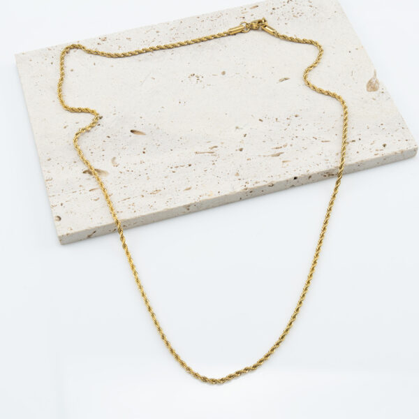 Ten stylowy łańcuszek zachwyca swoim charakterystycznym, plecionym splotem, który przypomina solidny sznur, nadając biżuterii wyrazisty i ponadczasowy wygląd. Całość w głębokim, złotym odcieniu mieni się subtelnie, idealnie wpisując się w trendy modowe i dodając charakteru każdej stylizacji – od codziennych zestawów po wieczorowe kreacje.