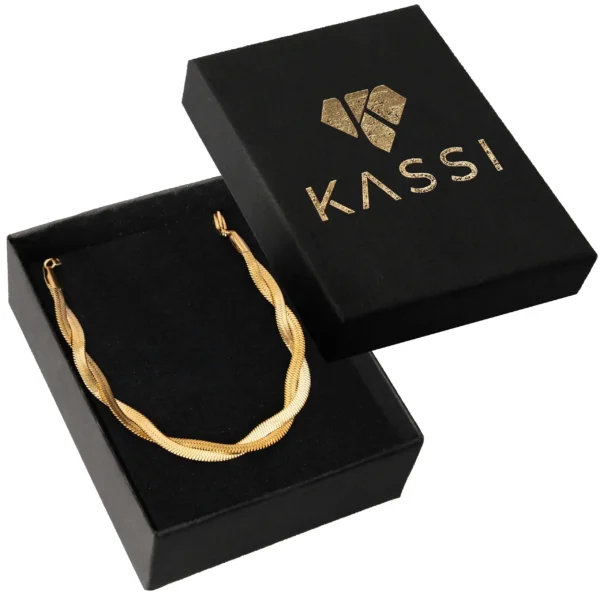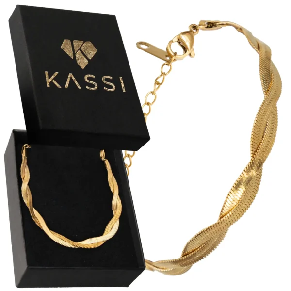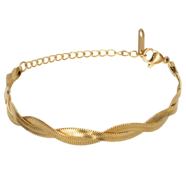 Wykonana ze stali szlachetnej i pozłacana, zachwyca unikalnym, plecionym splotem, który przypomina delikatne fale, dodając Twojemu nadgarstkowi subtelnego blasku. Jej złoty odcień pięknie mieni się w świetle, idealnie komponując się z każdą stylizacją – od casualowych po wieczorowe. Bransoletka nie zawiera niklu, więc jest bezpieczna dla alergików, a jej lekka konstrukcja zapewnia komfort noszenia. To doskonały wybór dla tych, którzy szukają biżuterii z charakterem – idealna na prezent lub jako wyjątkowy dodatek do Twojej kolekcji!