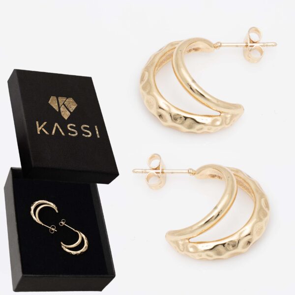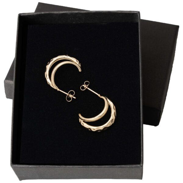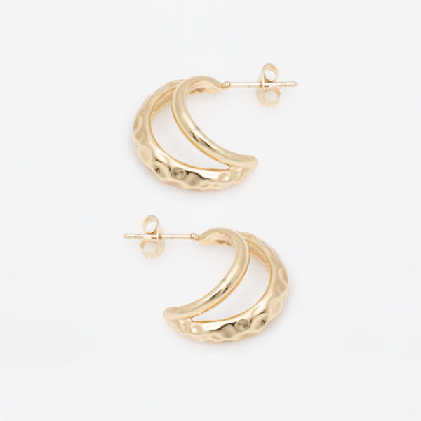 Kolczyki to eleganckie pozłacane kółka ze stali chirurgicznej z efektowną, młotkowaną fakturą. Ich nieregularna, chropowata powierzchnia pięknie łapie światło, nadając kolczykom głębi i luksusowego, ręcznie robionego charakteru.
