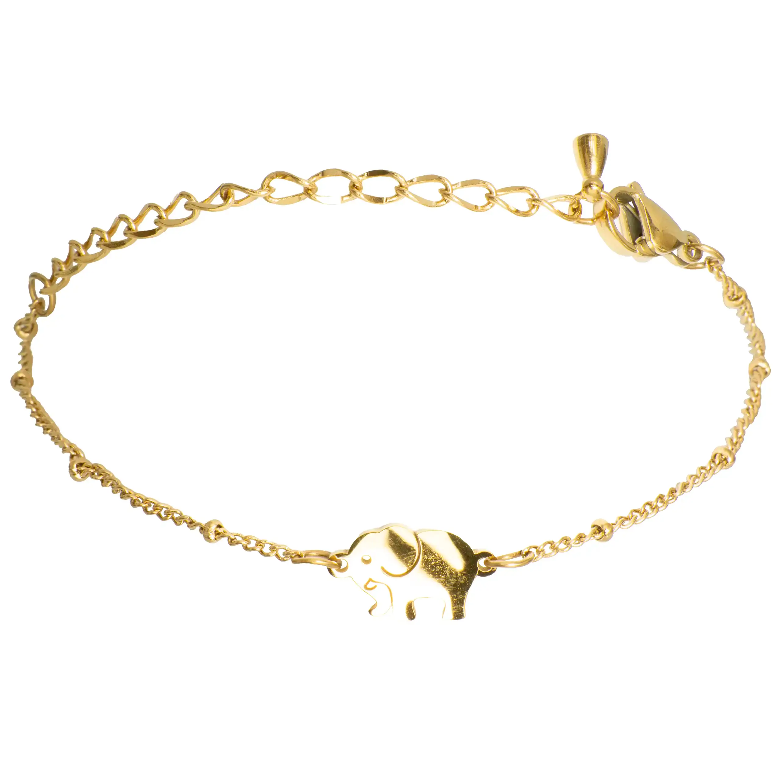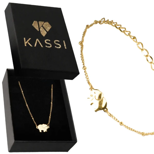 Odkryj magię tej wyjątkowej bransoletki pozłacanej, wykonanej z wysokiej jakości stali szlachetnej, która łączy subtelny design z głębokim znaczeniem. Centralnym punktem tej biżuterii jest uroczy wisiorek w kształcie słonia – symbolu szczęścia, mądrości i siły – który dodaje jej niepowtarzalnego charakteru. Delikatny, złocisty łańcuszek z subtelnymi kulkami rozmieszczonymi wzdłuż jego długości pięknie mieni się w świetle, czyniąc bransoletkę idealnym dodatkiem do codziennych stylizacji, jak i do ważnych wydarzeń, takich jak jubileusze, rocznice czy rodzinne uroczystości.