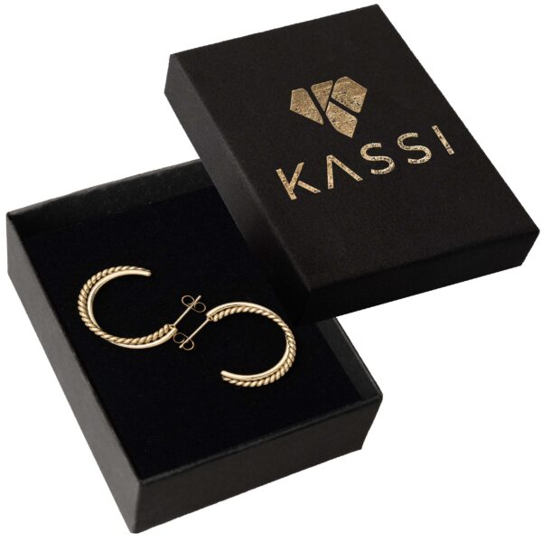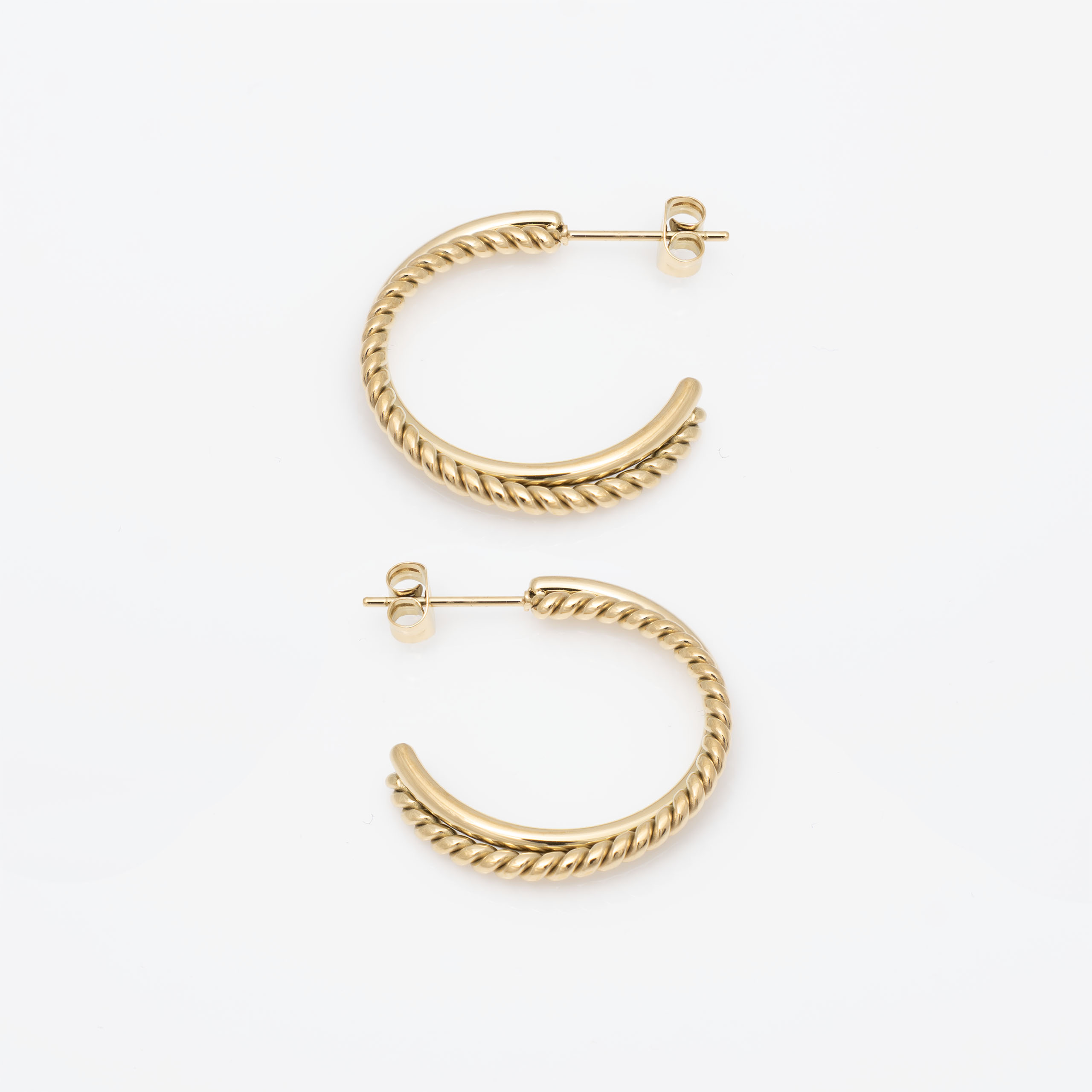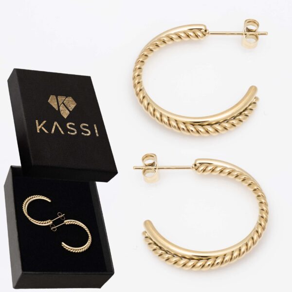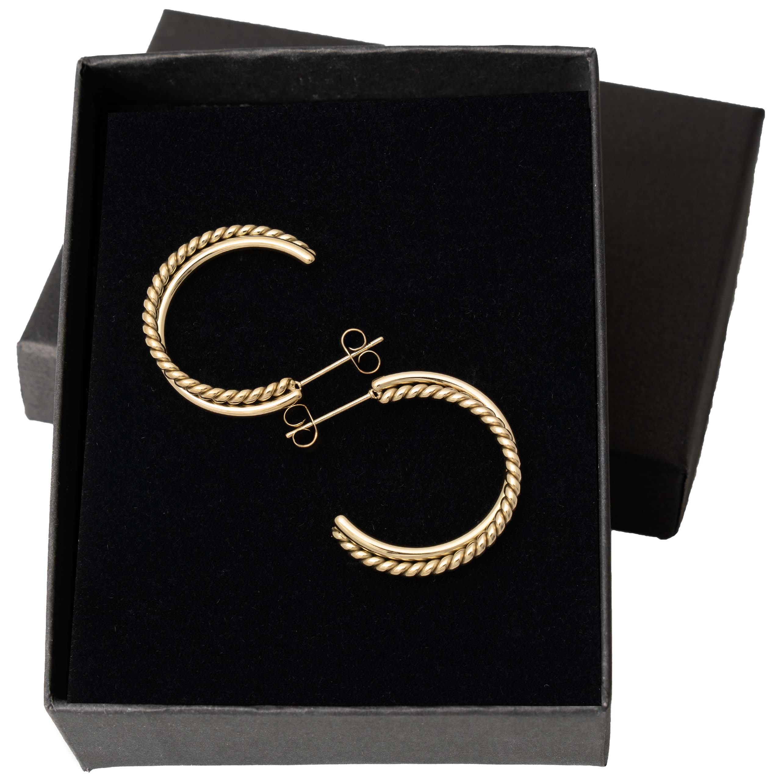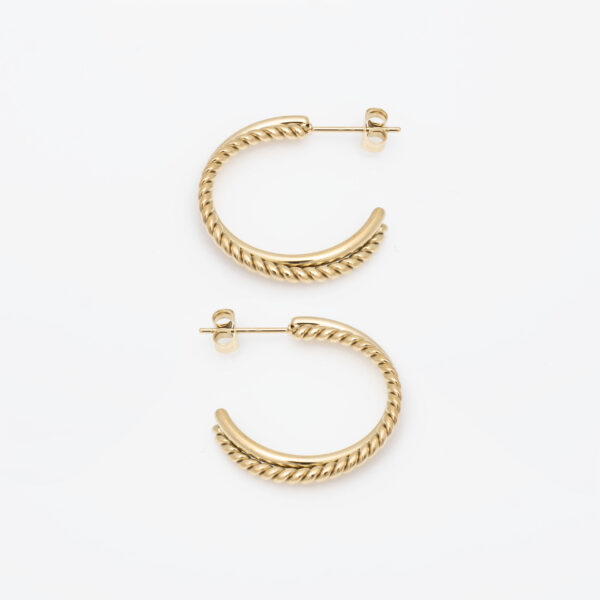 Stylowe pozłacane kolczyki kółka ze stali chirurgicznej z efektownym, plecionym wzorem rope. Klasyczna forma w nowoczesnym, skręcanym wydaniu – eleganckie i bardzo kobiece.