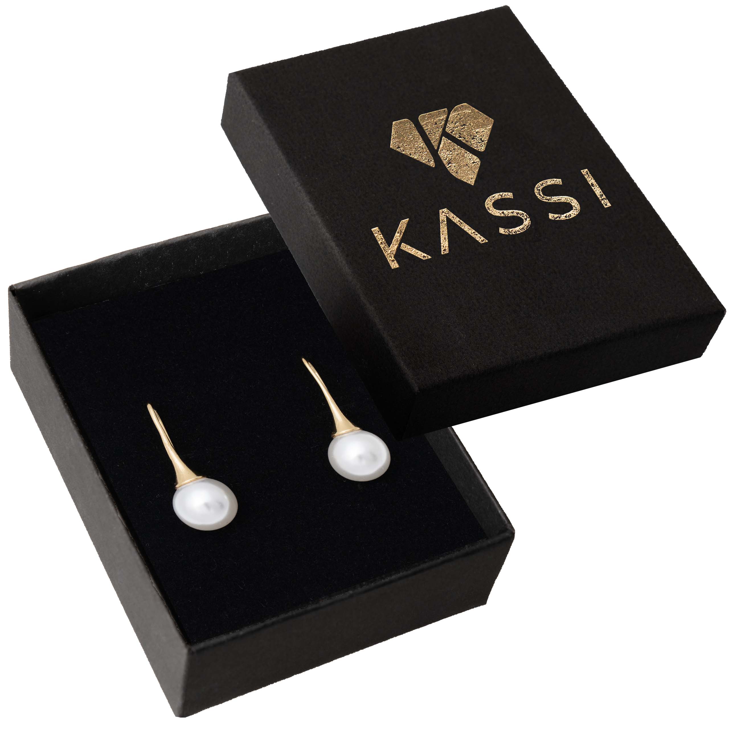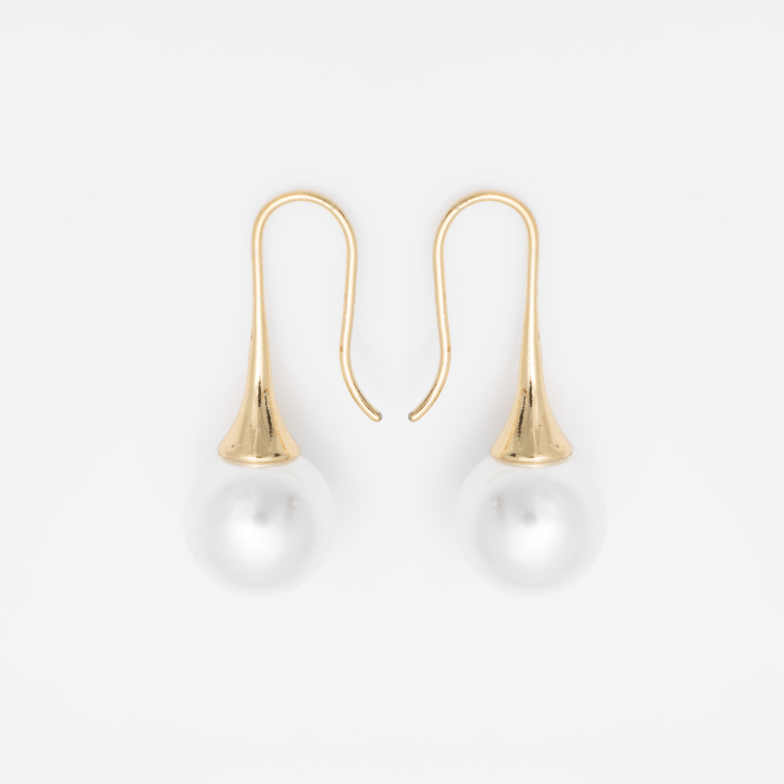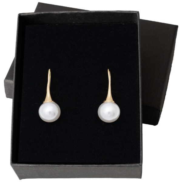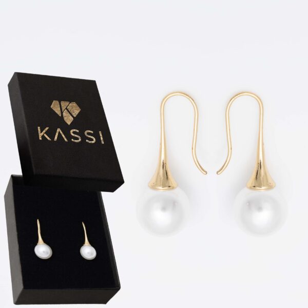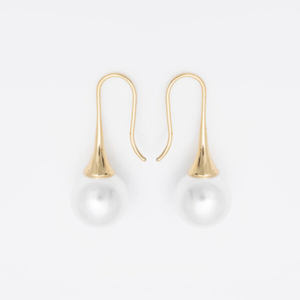 Eleganckie pozłacane kolczyki wiszące z dużą, lśniącą perłą. Charakterystyczny, wydłużony stożek w kolorze złota pięknie podkreśla białą perłę, tworząc klasyczny, ale bardzo kobiecy wygląd.