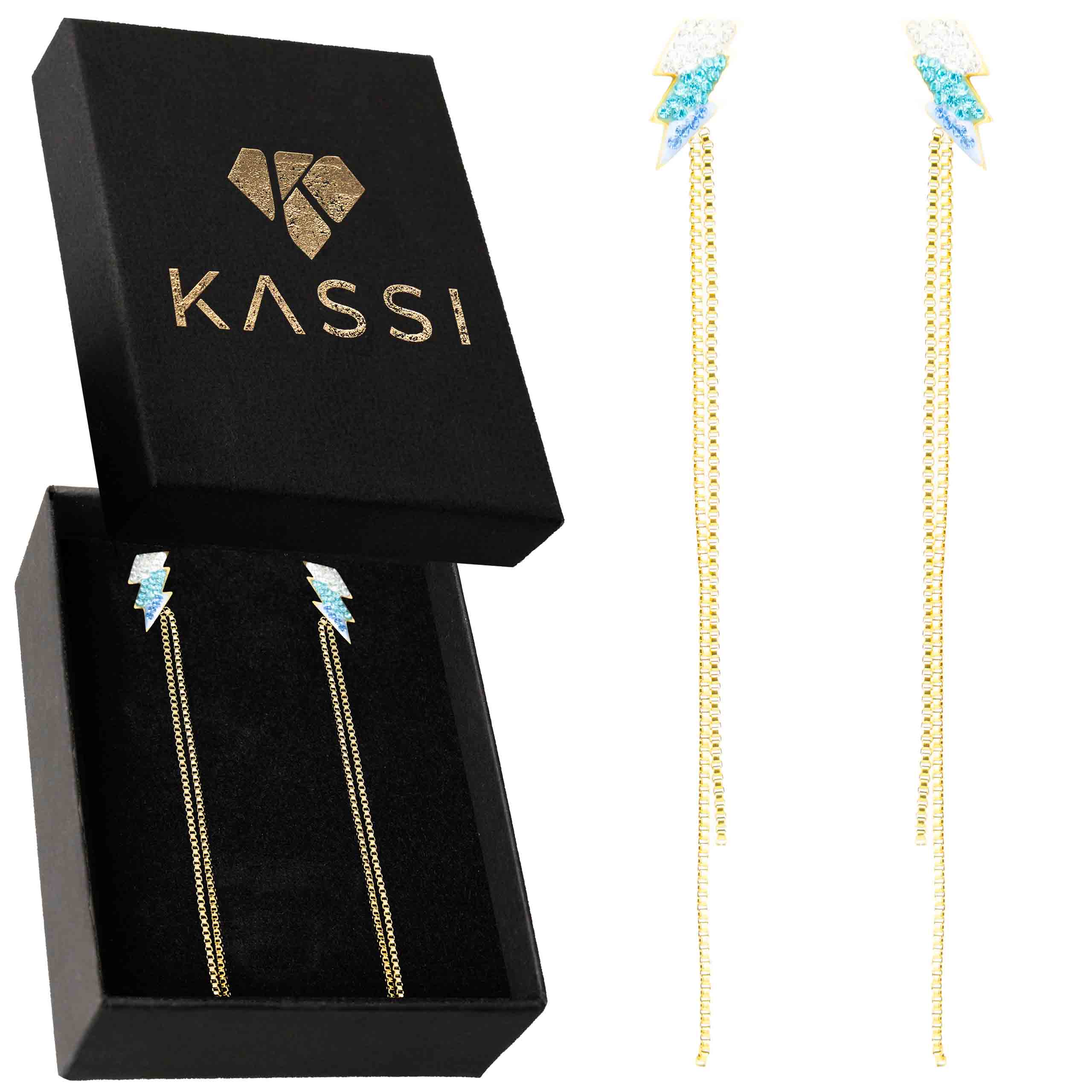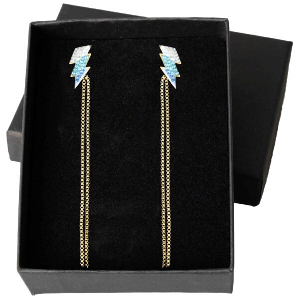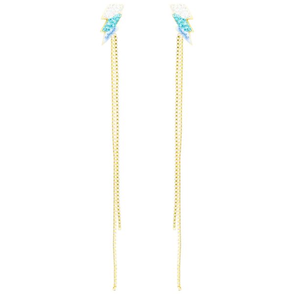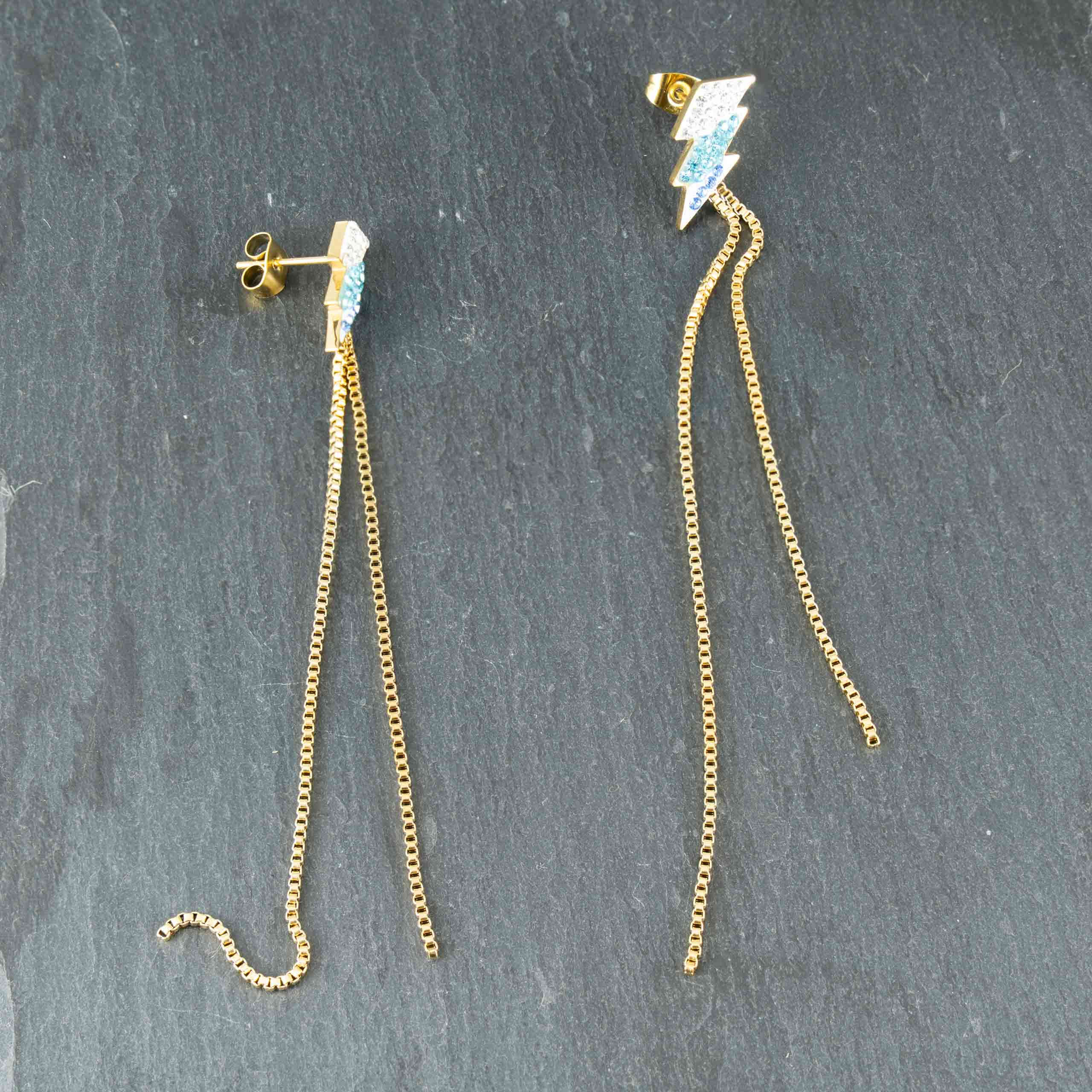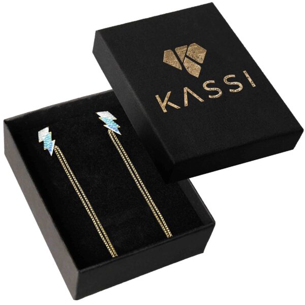 Złote kolczyki z kształtem pioruna i kryształami to połączenie nowoczesności i luksusu. Hipoalergiczne właściwości oraz unikalny design sprawiają, że są doskonałe na codzień i specjalne okazje. Szybka wysyłka w eleganckim pudełku!