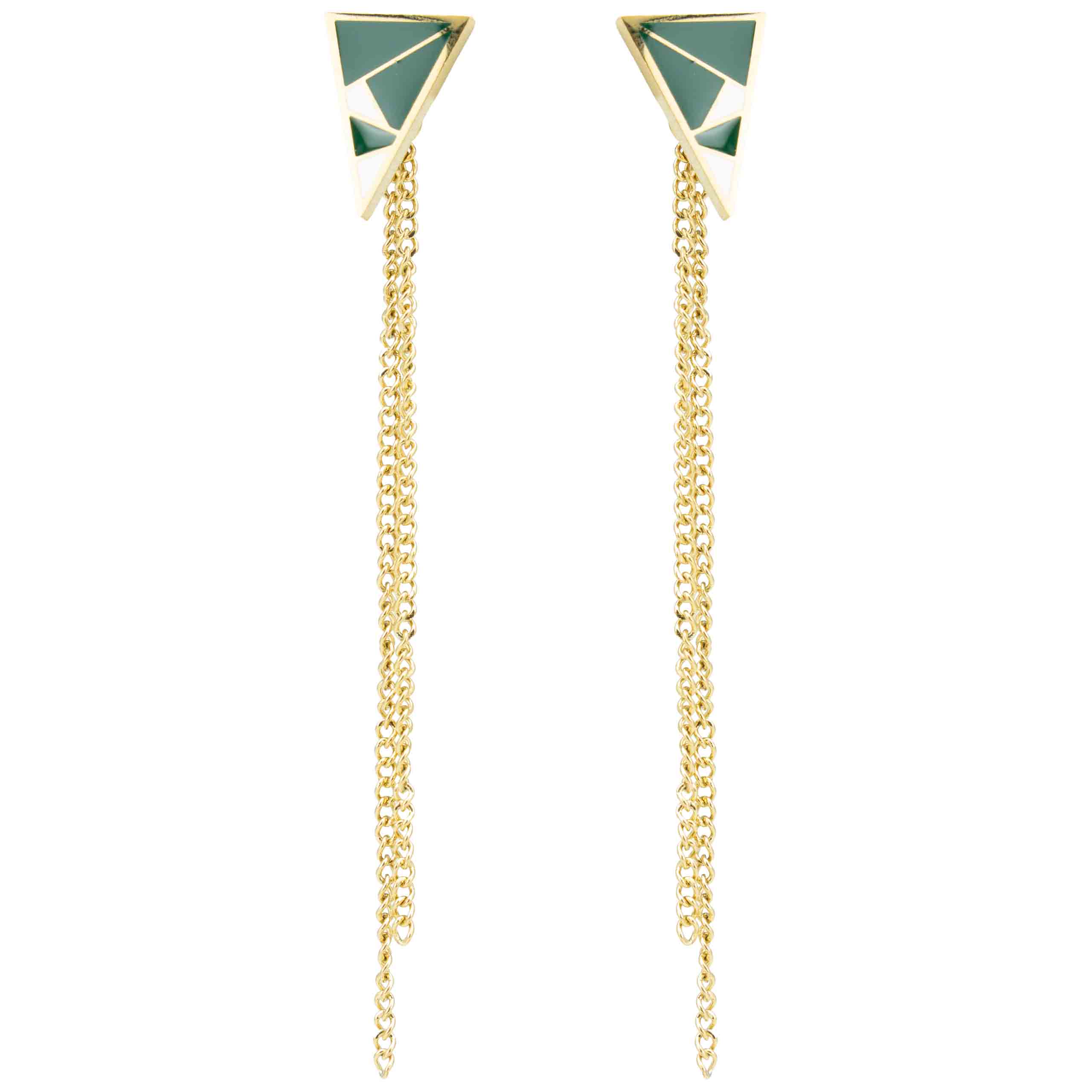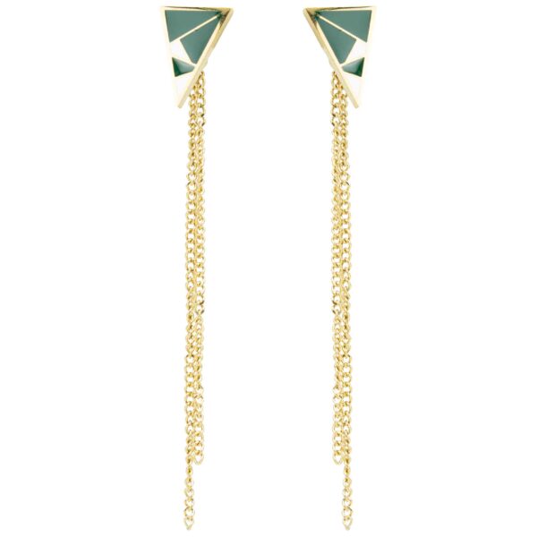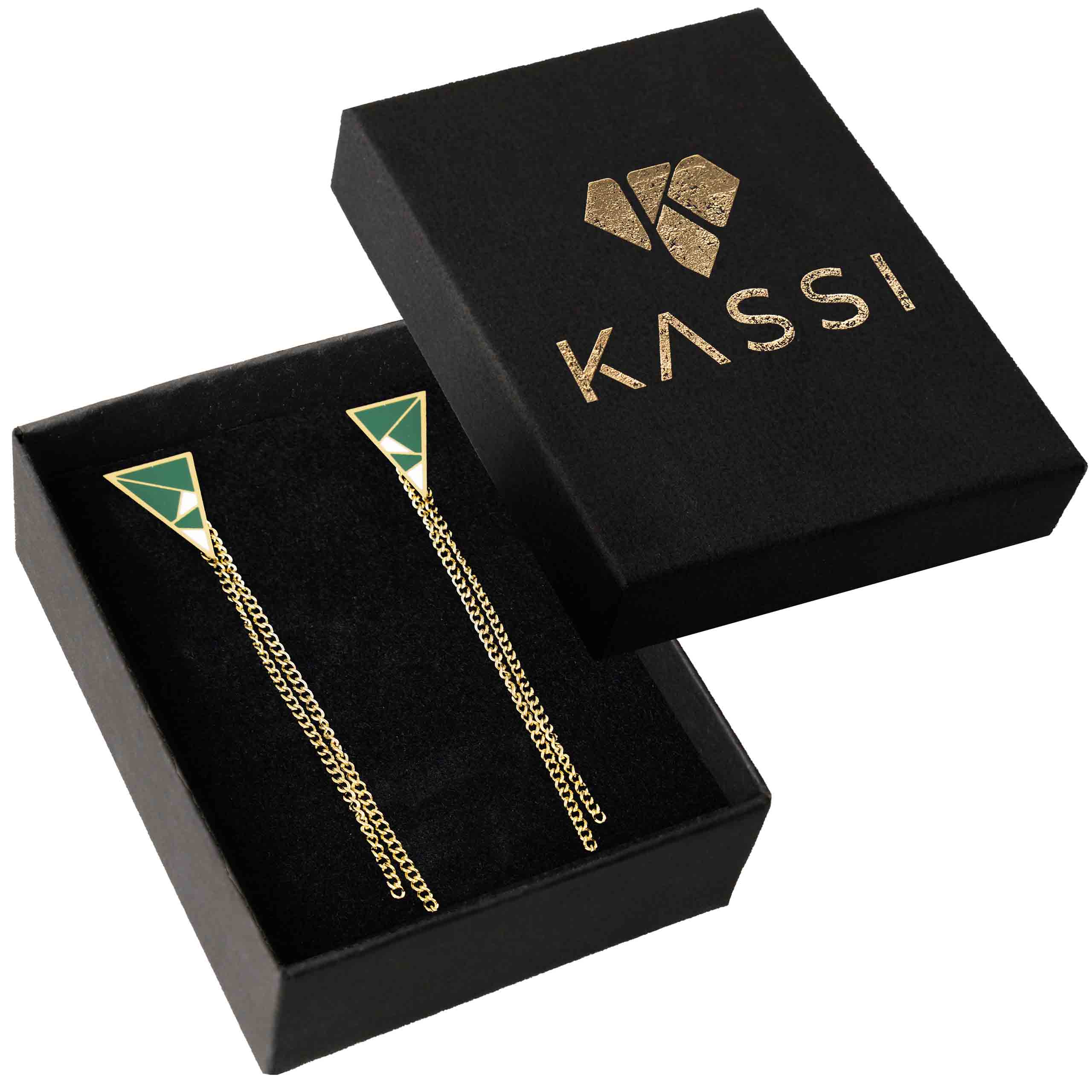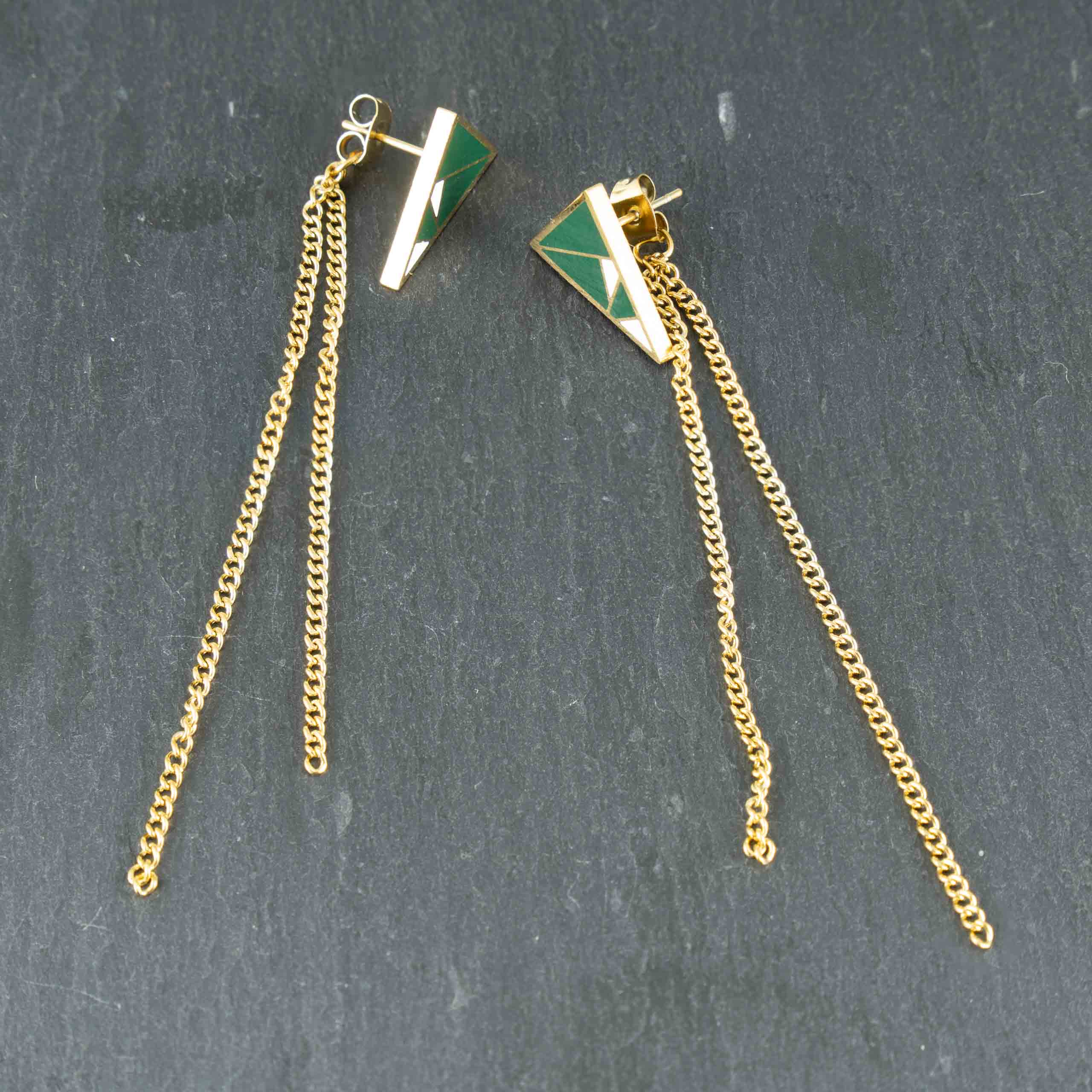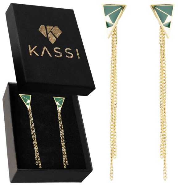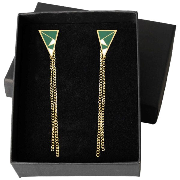 Te złote kolczyki z długimi łańcuszkami wyróżniają się unikalnym designem z zielonymi trójkątami, idealnym dla miłośniczek nowoczesnej biżuterii. Eleganckie wykończenie i solidne wykonanie gwarantują satysfakcję. Szybka wysyłka w eleganckim opakowaniu!