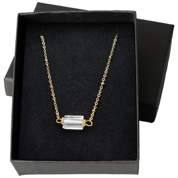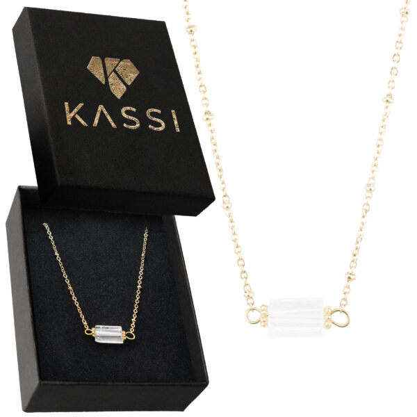 Ten wyrafinowany naszyjnik łączy prostotę z naturalnym pięknem, będąc idealnym dodatkiem dla miłośników klasycznej biżuterii. Wykonany z pozłacanej stali chirurgicznej, która gwarantuje trwałość i hipoalergiczne właściwości, zapewnia komfort noszenia przez cały dzień. Centralnym elementem jest naturalny kwarc kamienny – ręcznie oszlifowany kamień o przejrzystym lub lekko mlecznym odcieniu, który zachwyca swoją czystością i subtelnymi inkluzjami. Regulowany łańcuszek z precyzyjnym zapięciem oraz delikatnymi złotymi akcentami pozwala na idealne dopasowanie, a minimalistyczny design sprawia, że pasuje zarówno do codziennych, jak i bardziej eleganckich stylizacji. Prezentowany w eleganckim czarnym pudełku, stanowi doskonały wybór jako prezent lub osobista ozdoba.